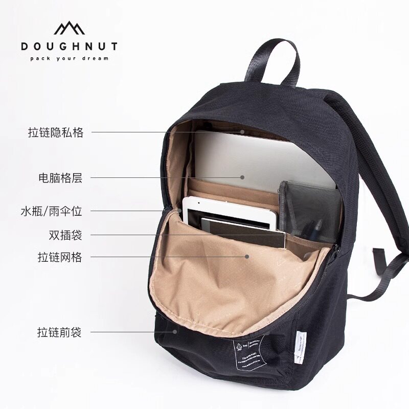 【全新正品】Doughnut甜甜圈双肩包,源自香港原创设计品牌,专为大学生及都市青年打造。采用高品质防泼水面料,轻盈耐用,兼具时尚与实用。多隔层设计,轻松收纳15.6英寸笔记本电脑、课本、文具及日常用品,主袋、前袋、侧袋分区合理,取物便捷。加宽减压肩带与透气背垫设计,长时间背负依然舒适。简约百搭的配色与经典甜甜圈Logo点缀,彰显青春活力。无论是上课通勤、短途旅行还是日常出街,都是理想伴侣。正品保障,细节精致,是追求品质与风格并重的你不可错过的出行单品。