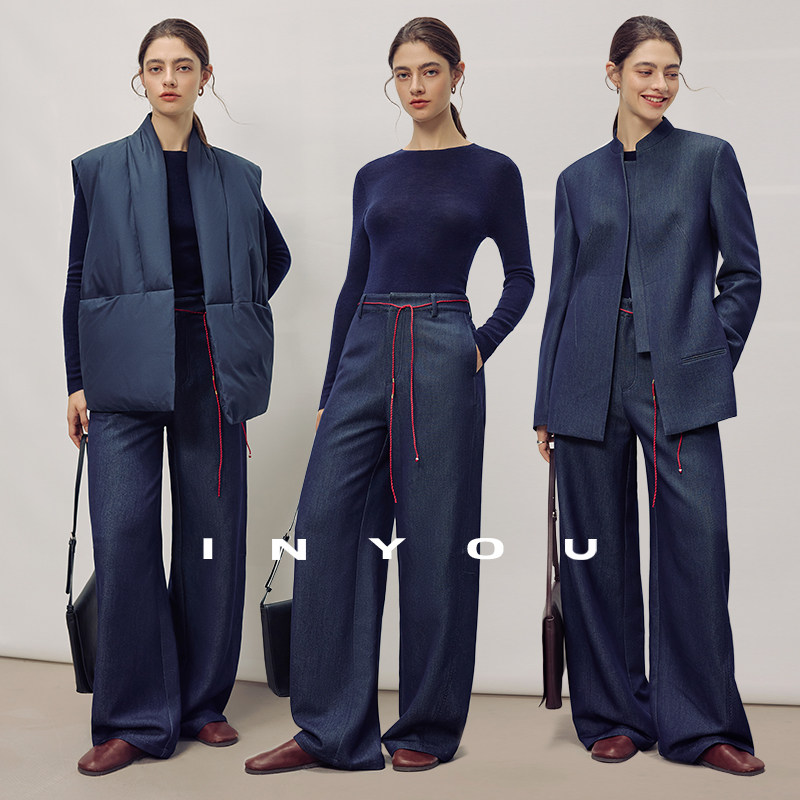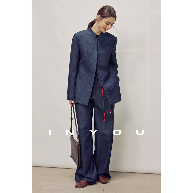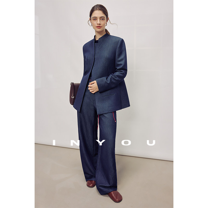 淘宝因由新中式立领收腰仿牛仔西装外套马甲弯刀裤时尚套装女三件套