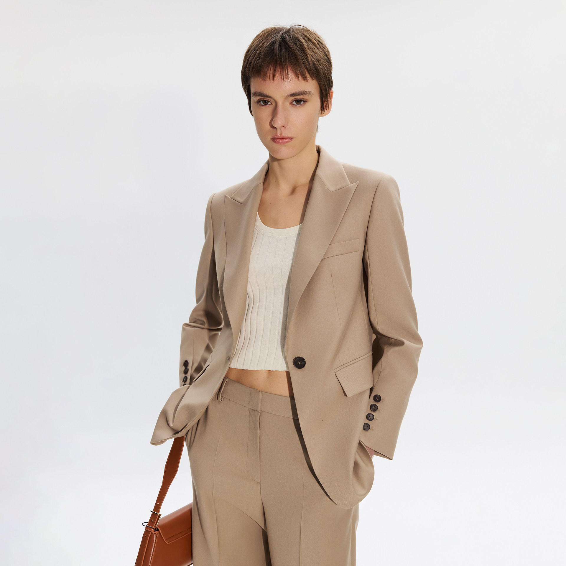 EiLEENELITEE 2025秋季新款职场通勤西装套装,以高级质感面料打造,融合现代极简设计与实用主义理念。宽松剪裁兼顾舒适与优雅,西装外套线条利落,微廓形设计修饰身形;搭配同色系高腰西裤,垂坠感佳,轻松穿出干练气质。细节处融入精致缝线与隐形口袋,彰显品质工艺。整体色调以经典黑、燕麦灰、深咖为主,百搭易穿,适配多种职场场景。无论是会议、通勤还是轻商务场合,皆能展现独立女性的自信与从容,是追求品质与风格并存职场女性的理想之选。