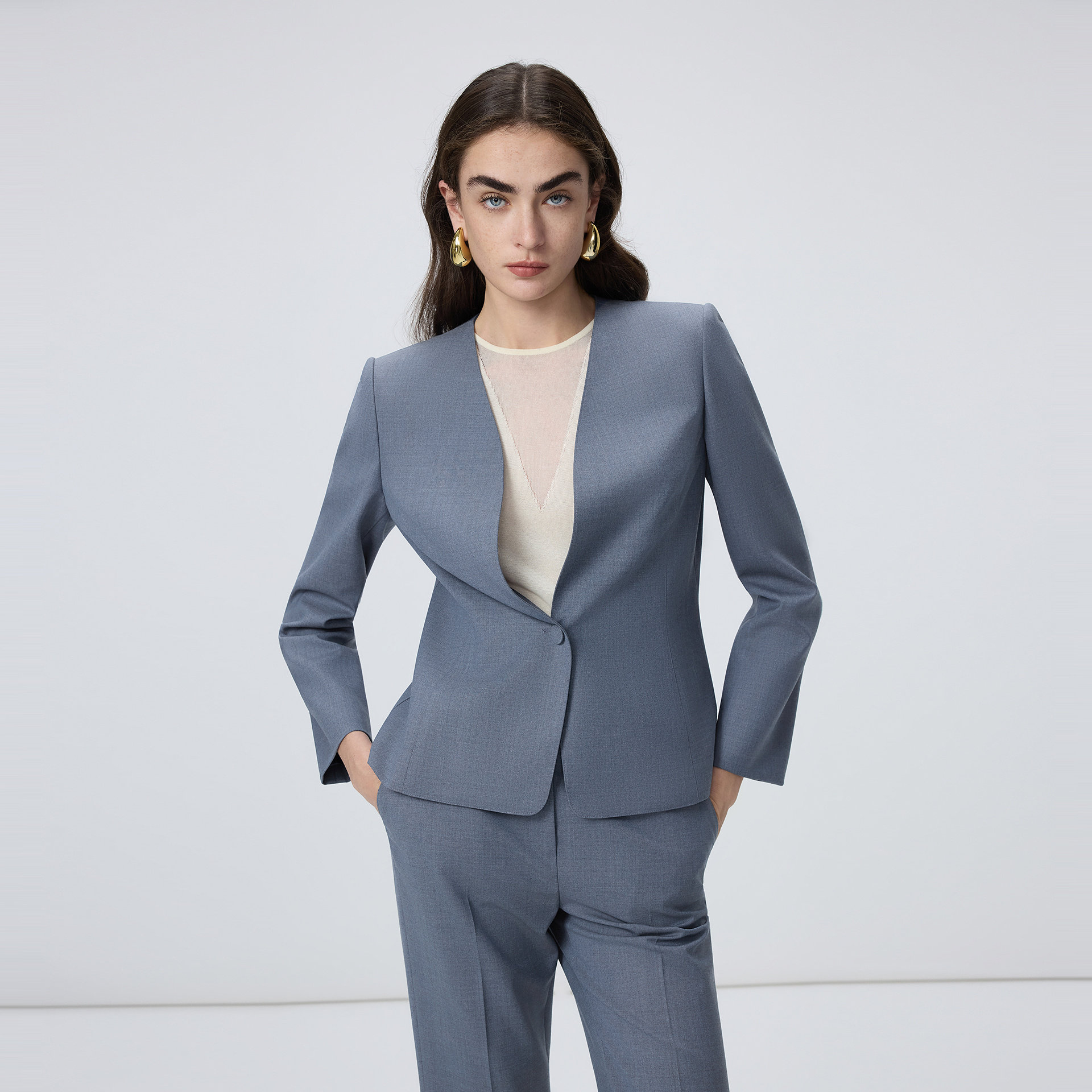 朗姿2026年春季新款羊毛无领西服套装,以简约利落的剪裁诠释现代职场女性的优雅与力量。采用高品质羊毛面料,触感柔软、垂坠有型,兼具保暖性与透气性。无领设计打破传统束缚,搭配流畅肩线与微收腰廓形,凸显干练气质又不失时尚感。西裤高腰直筒版型,修饰腿型,行走间尽显从容气度。整体设计融合通勤实用与艺术美学,可轻松驾驭会议、办公或轻商务场合,是追求质感与风格的职场女性的理想之选。朗姿以匠心工艺,重塑都市女性自信风采。