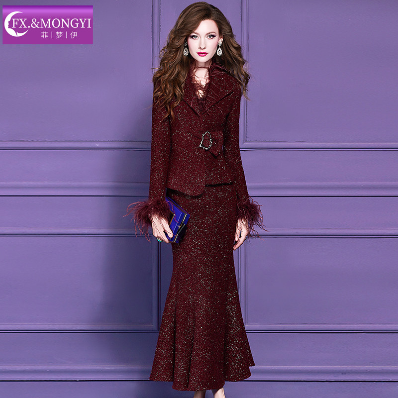 天猫菲梦伊高级感小香风套装女冬季轻熟优雅亮片西装领毛呢外套鱼尾裙