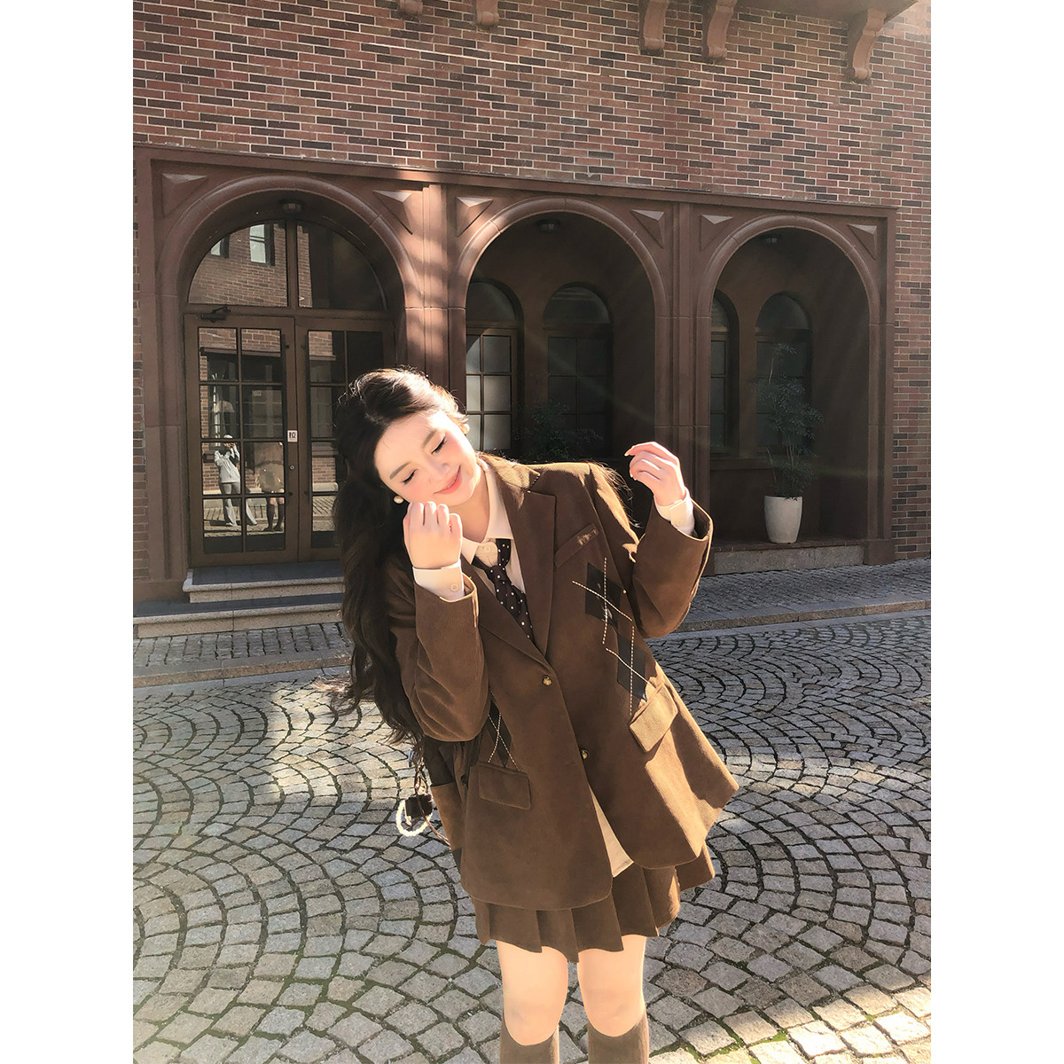 淘宝安妮不火 减龄学院风格纹贴布绣三件套女微胖大码灯芯绒西装外套