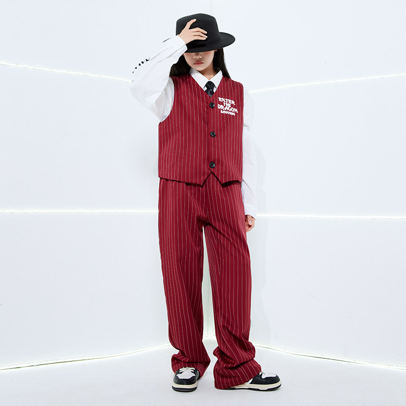 天猫儿童爵士舞套装酒红西装马甲潮服男童街舞Popping演出服locking女