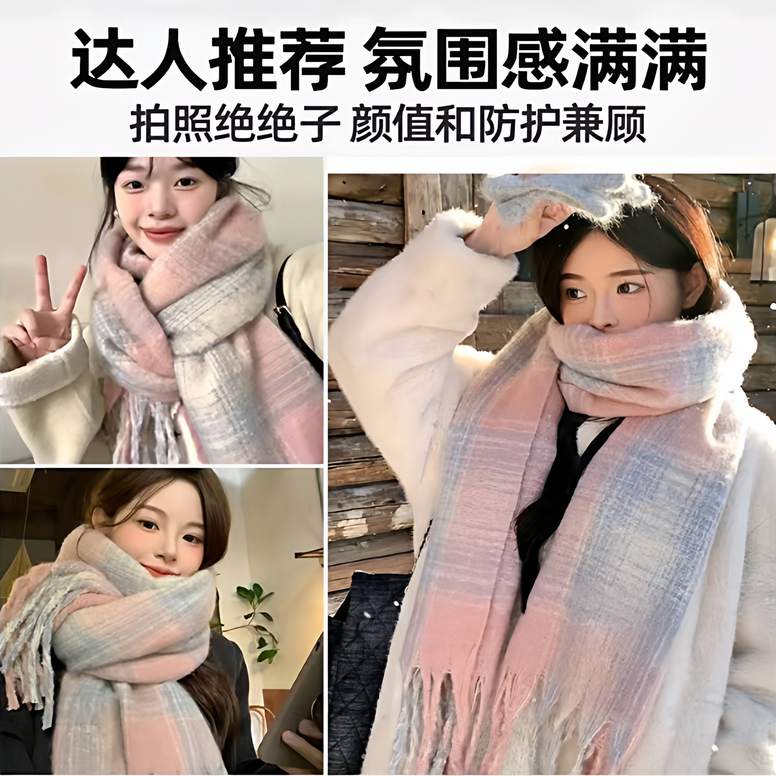 淘宝韩系粉色格子流苏围巾女秋冬季加厚保暖学院风氛围感学生披肩围脖
