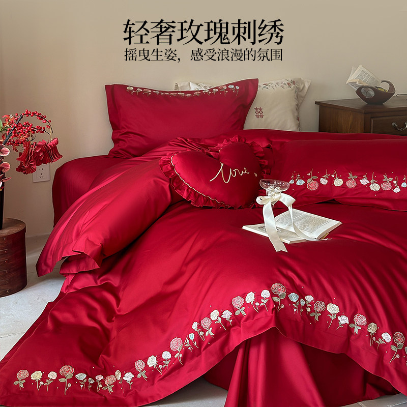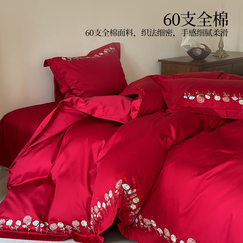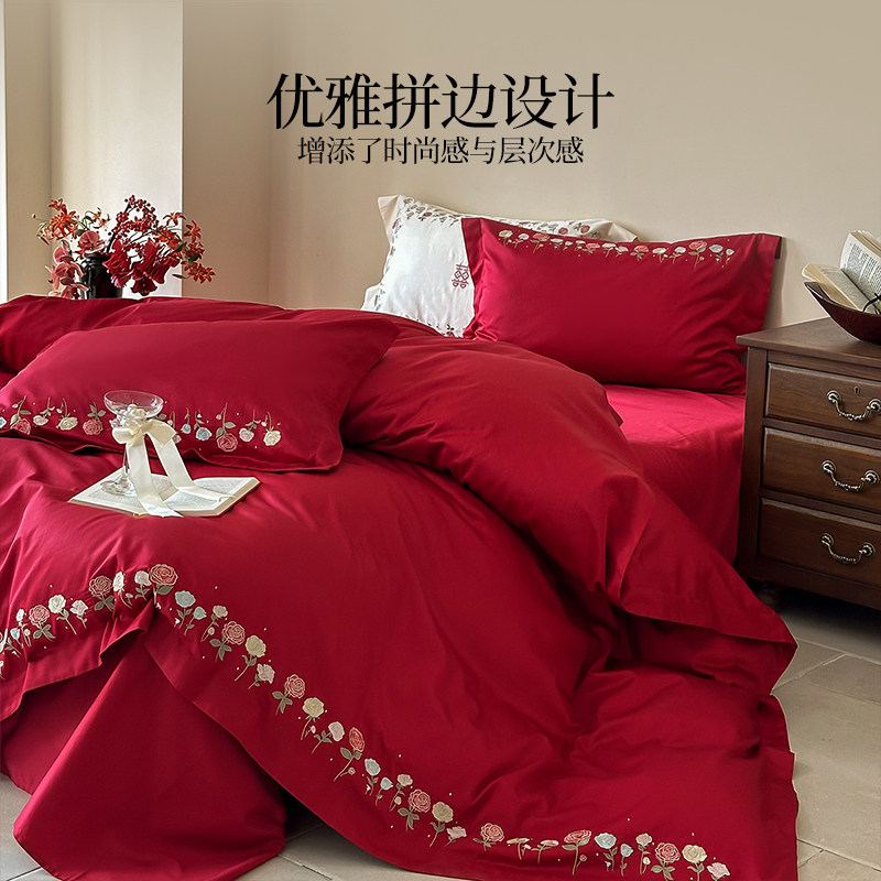 法式100支长绒棉四件套婚庆纯棉刺绣被套红色喜庆全棉床单1.8床品