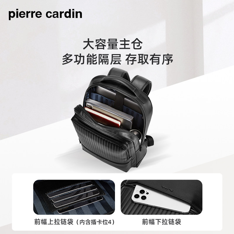 皮尔卡丹男士双肩包,精选头层牛皮打造,质感细腻,彰显商务精英风范。大容量设计,分层合理,轻松容纳15.6英寸笔记本电脑、文件、衣物等出差必需品,满足日常通勤与差旅需求。加厚背垫与可调节肩带,背负舒适减压,长时间使用不疲劳。简约大气的外观融合精致五金件,细节考究,尽显低调奢华。无论是职场出行还是短途旅行,这款真皮双肩包都是男士的理想之选,兼顾实用性与时尚品味,展现成熟稳重气质。