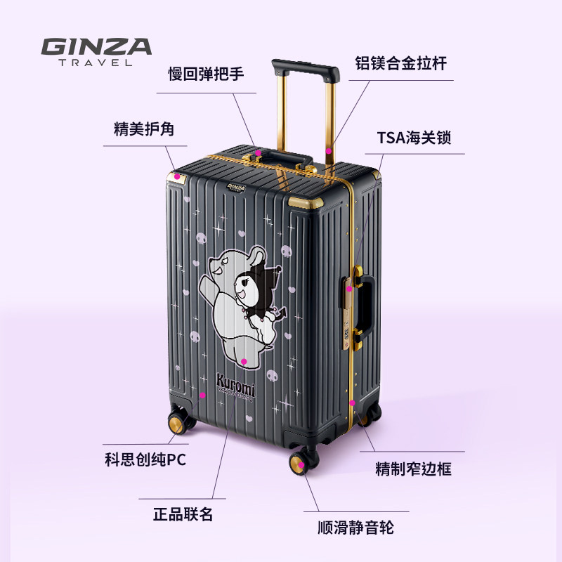 2025年银座与Sanrio旗下人气角色酷洛米(Kuromi)携手推出全新联名20寸拉杆行李箱,专为时尚女性打造。这款登机箱采用酷洛米标志性紫黑配色,搭配俏皮刺绣与立体耳朵设计,萌趣十足又不失高级感。箱体轻盈坚固,配备360°静音万向轮与顺滑拉杆,出行便捷无忧。内部空间合理分区,满足短途旅行或日常通勤需求。无论是自用还是作为礼物赠送闺蜜、女友,都是兼具颜值与实用的贴心之选。银座x酷洛米联名款,让每一次出行都充满可爱仪式感,是2025年不可错过的潮流单品。
