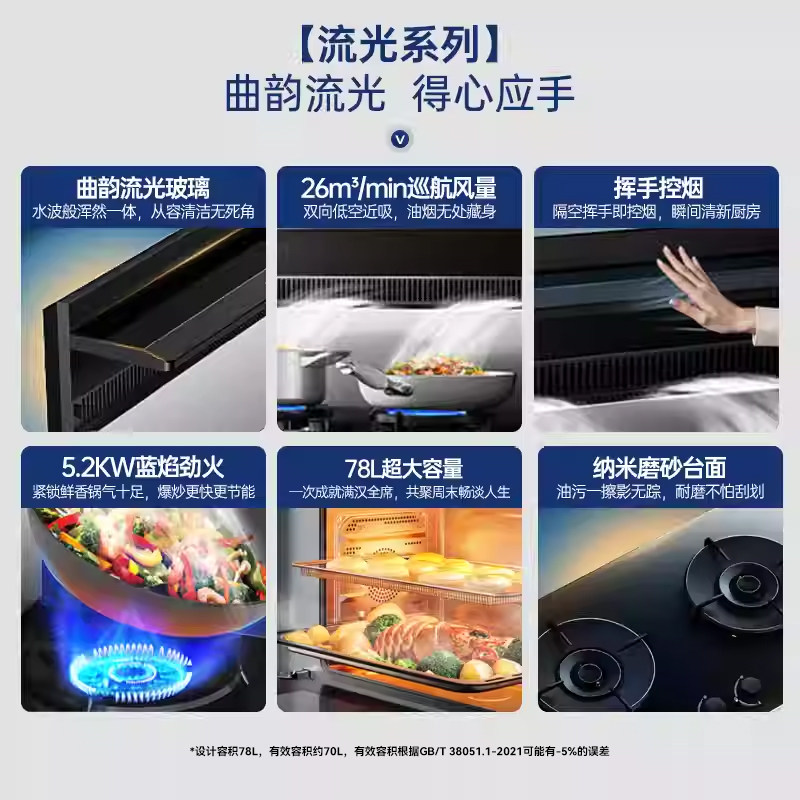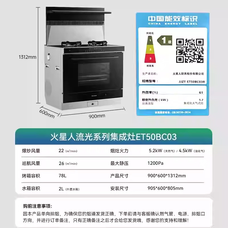 【重磅升级】火星人ET50BC03流光系列集成灶,集烟机、灶具、蒸箱、烤箱于一体,重新定义现代厨房体验。采用全新流光镜面设计,质感出众,轻松融入高端家居风格。搭载直流变频电机,实现21m³/min大吸力,瞬吸油烟,厨房持久清新。创新双腔独立蒸烤技术,左蒸右烤同步进行,高效省时,满足多样烹饪需求。配备智能触控面板与APP远程操控,操作便捷更省心。一级能效、低噪音运行,兼顾环保与舒适。火星人ET50BC03以科技赋能烹饪,打造健康、高效、智能的厨房新生态,让每一餐都成为生活仪式感的体现。官方品质保障,值得信赖。