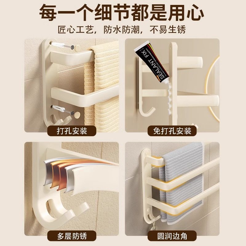 奶油风免打孔太空铝毛巾架,采用优质太空铝材质,轻盈坚固、防锈耐腐蚀,表面经细腻喷涂工艺处理,呈现温润奶油色调,质感高级,轻松融入现代、北欧或侘寂风格卫浴空间。创新免打孔设计,搭配高强度粘胶或吸盘安装,无需破坏墙面,稳固承重,拆卸无痕。提供单杆、双杆及置物架多种组合,满足毛巾、浴巾分类悬挂与收纳需求,节省空间又提升美观度。适用于卫生间、浴室、厨房等潮湿环境,安装简便,清洁便捷,是追求颜值与实用兼具的理想之选。