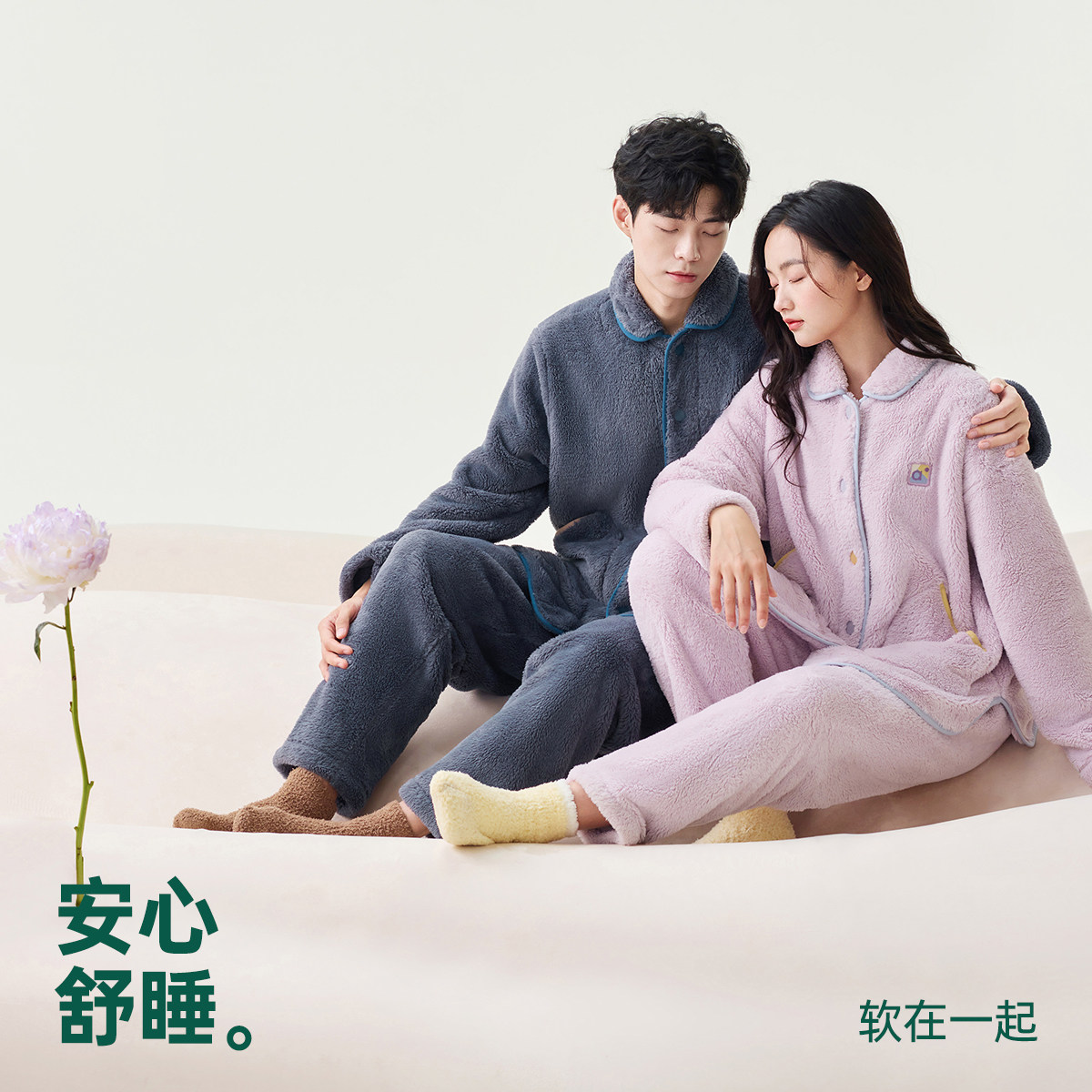 淘男士睡衣秋季纯棉磨毛绒布情侣女士秋冬简约高级感长袖家居服套装