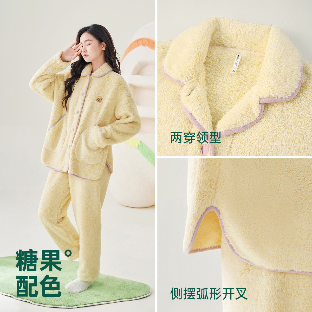 【双层加厚】睡衣秋冬季男款加绒羊羔拉链冬天珊瑚绒情侣家居服女