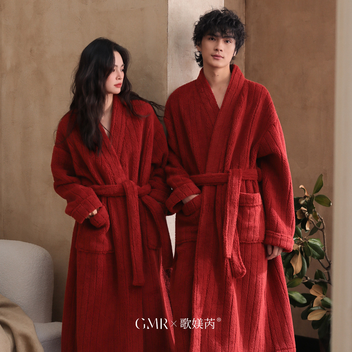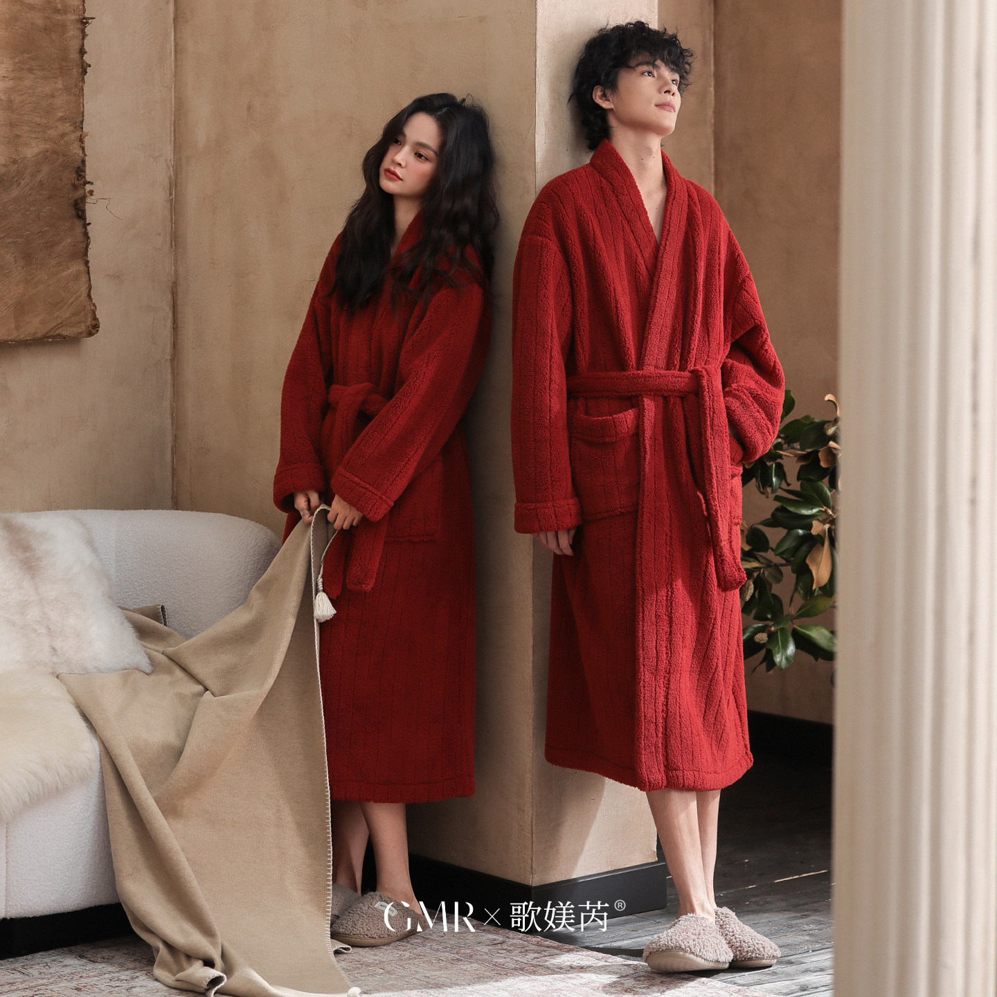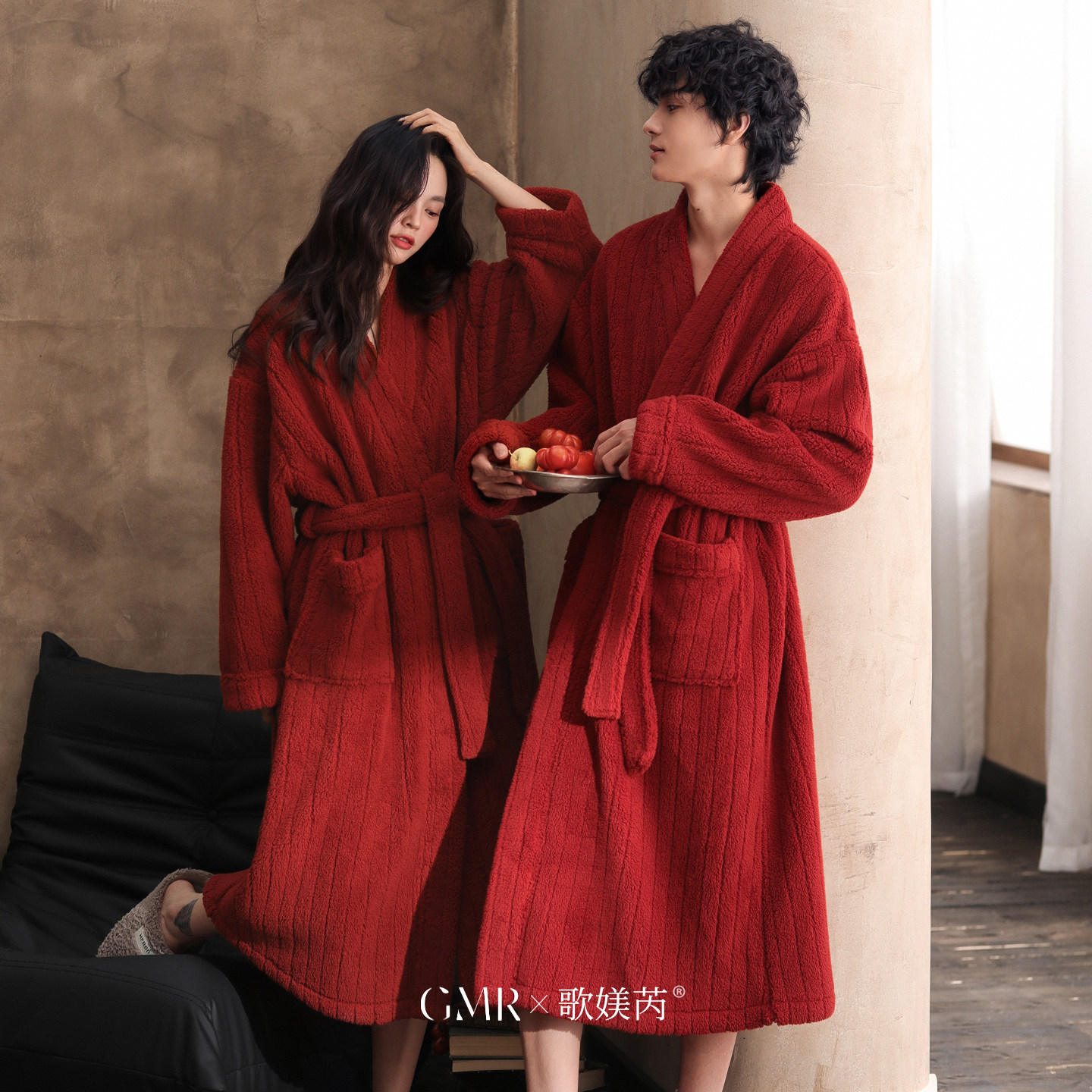 天猫红色情侣睡袍2025新款秋冬季珊瑚绒加厚结婚睡衣男女士浴袍家居服