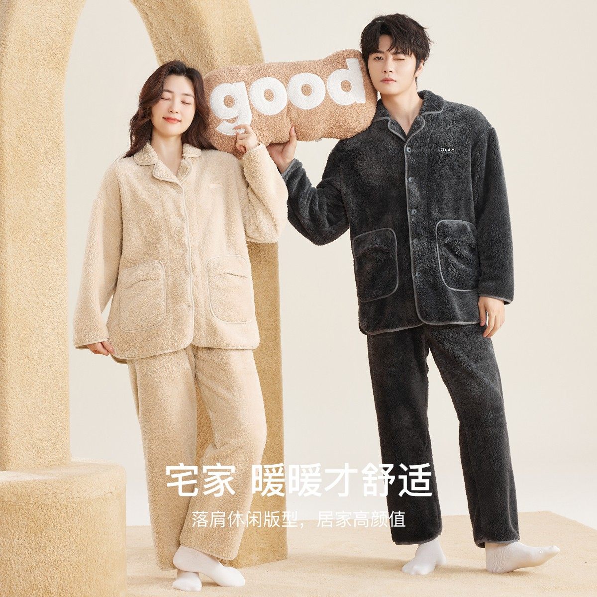 芬腾情侣睡衣珊瑚绒秋冬加绒加厚女士套装法兰绒休闲保暖家居服男