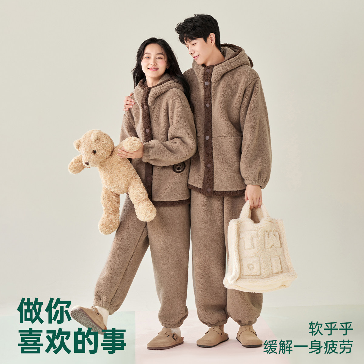 安之伴【巨保暖】珊瑚绒情侣睡衣套装,专为秋冬温暖设计,采用高品质珊瑚绒面料,触感柔软细腻,锁温保暖性能卓越。女款与男款均配备可爱连帽设计,增添俏皮气息,同时提升防风效果。宽松舒适的版型,适合居家、睡眠或休闲时光,男女同款更添甜蜜互动感。袖口与下摆贴合设计,有效防止冷风侵入。多色可选,满足不同审美需求。无论是自用还是作为情侣礼物,都是秋冬保暖的贴心之选。安之伴,用温暖陪伴每一个寒冷夜晚,让爱意在家中静静流淌。