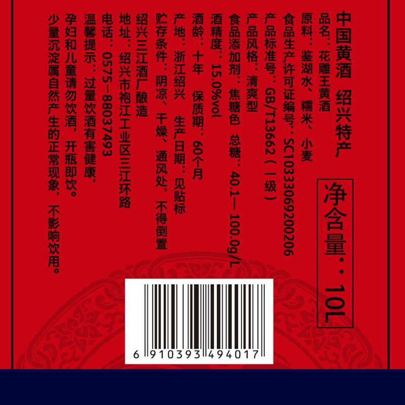 天猫绍兴特产黄酒老闸十年陈花雕王10kg20斤手工半甜糯米加饭老酒坛装