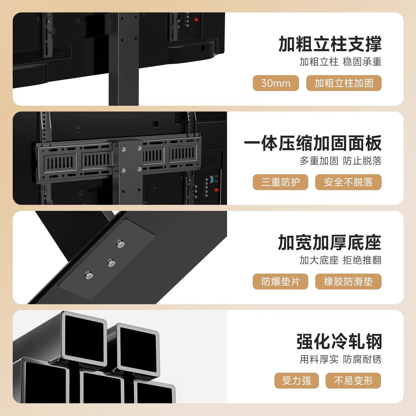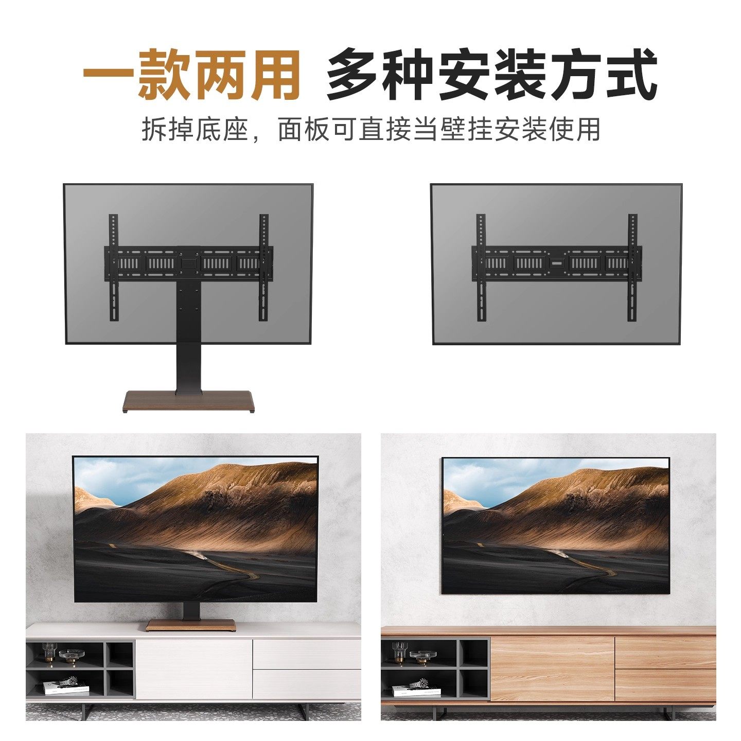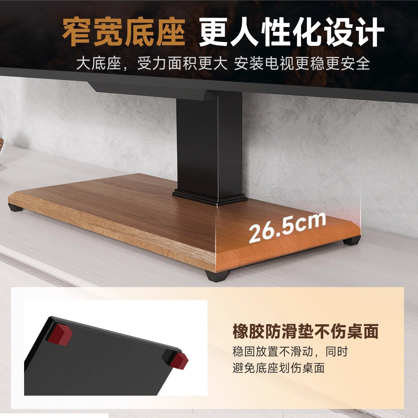 通用电视机桌面底座专为TCL、海信、创维等主流品牌的55-65英寸电视设计,无需打孔即可稳固安装,轻松实现免打孔垫高与增高功能。采用高强度合金材质,承重能力强,结构稳固,有效防止电视倾倒,保障使用安全。底座高度可调节,提升观看舒适度,同时优化空间布局,让电视位置更符合人体工学。安装简便,兼容多种机型,适配不同厚度电视背板。底部防滑设计,保护桌面不被刮伤。无论是客厅、卧室还是办公室,这款支架都能为您的电视提供稳定、美观的支撑解决方案,提升观影体验与家居质感。