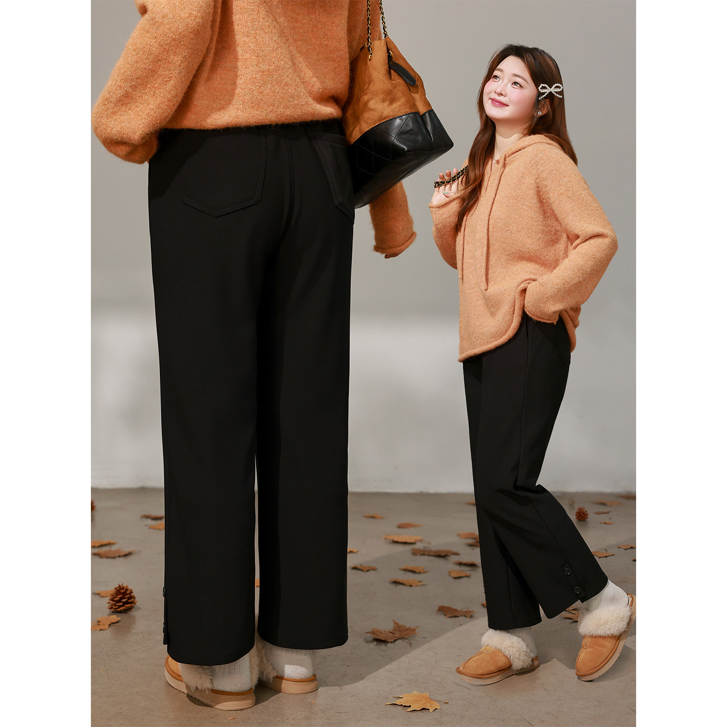 胖mm冬季简约直筒休闲裤木子理想大码女装松紧腰百搭磨毛厚长裤子