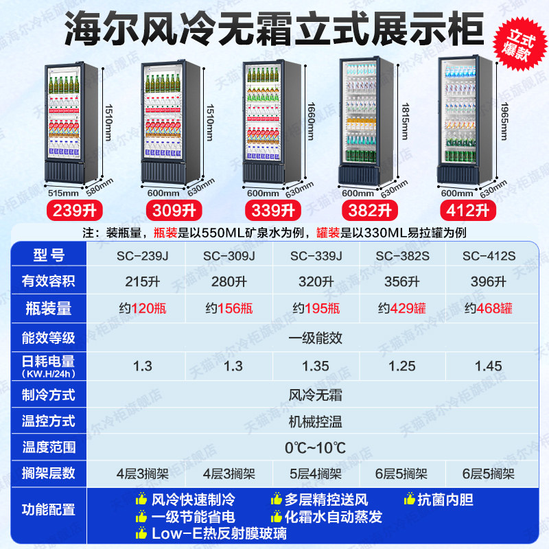 天猫海尔冷藏柜展示柜风冷无霜339/537L升商用饮料柜冰箱展示柜保鲜柜