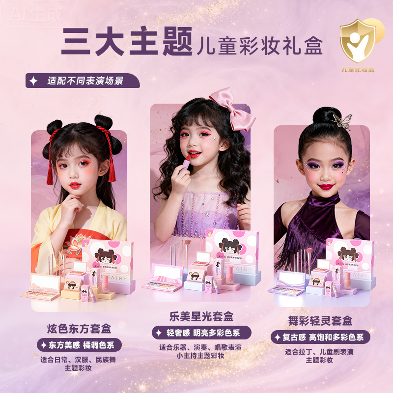 柒小仙儿童专用化妆品套装,专为女孩设计的安全彩妆套盒,是六一儿童节、舞台表演或日常角色扮演的理想礼物。产品采用温和无刺激的植物成分,通过国家质检认证,不含重金属与有害添加剂,呵护宝宝娇嫩肌肤。套装包含腮红、眼影、口红、亮片贴纸等多样彩妆工具,色彩鲜艳、易上色、易清洗,让孩子轻松打造梦幻舞台妆效。包装精美可爱,附赠收纳盒,方便携带与整理。柒小仙坚持“安全第一,快乐美妆”理念,让每个小女孩在自信绽放的同时,享受健康、安心的美丽体验,是家长放心、孩子喜爱的专属彩妆选择。