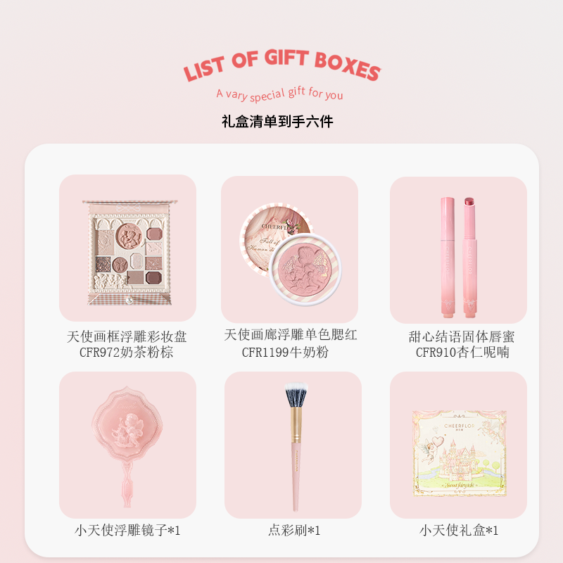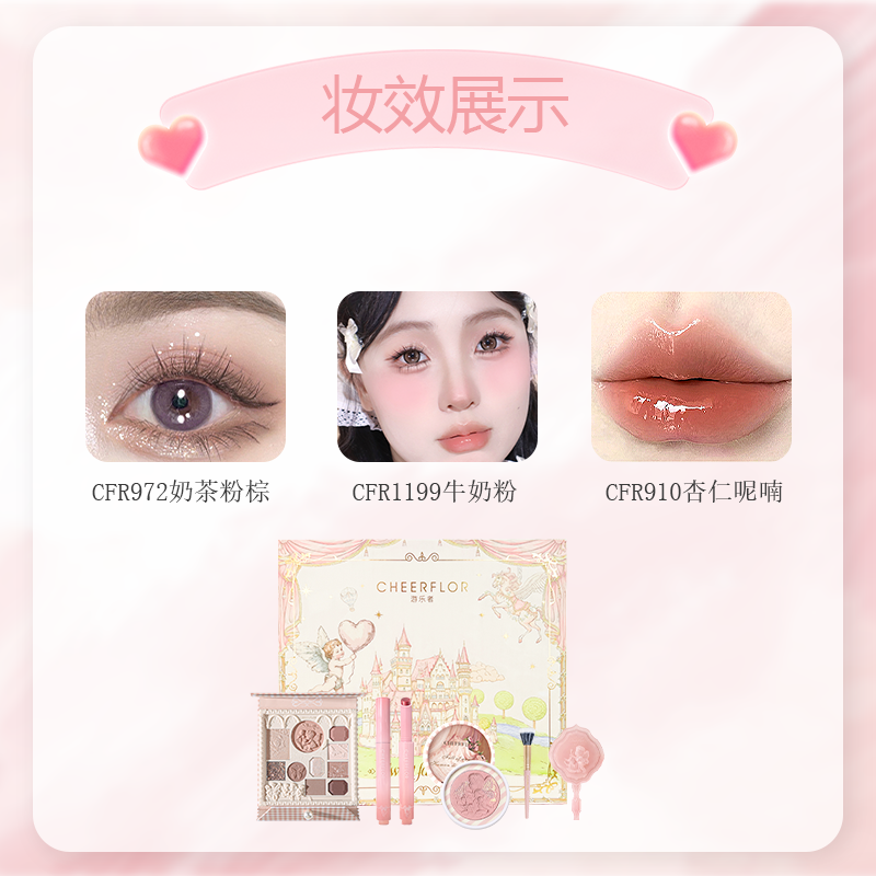 【新年礼物】CheerFlor彩妆礼盒,专为初学者设计的全能化妆品套装,是送给女友、闺蜜的贴心好礼。礼盒内含眼影、腮红、口红、粉底等多款实用彩妆,色彩温柔百搭,轻松打造自然清新妆容。产品质地细腻,易上手,特别适合化妆新手快速掌握技巧。精美包装喜庆大方,洋溢节日氛围,无论是生日、新年还是纪念日,都能传递满满心意。CheerFlor注重安全与品质,温和不刺激,让美丽更安心。一份礼盒,承载祝福与惊喜,让她在新的一年绽放自信光彩,是表达关爱与心意的完美选择。