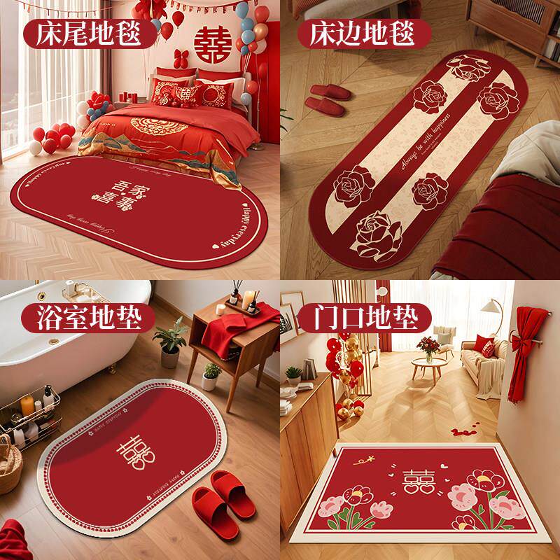 淘宝结婚喜庆床边毯卧室入户红色飘窗垫子喜字婚房布置房间床前地垫