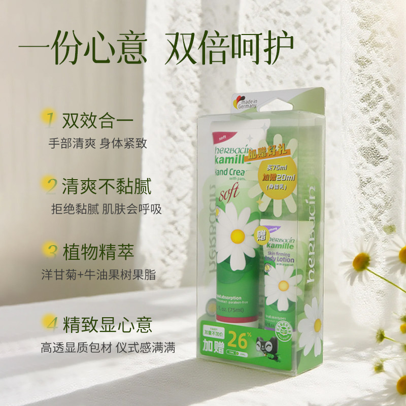 【下拉领优惠】德国小甘菊清爽护手霜,源自天然洋甘菊精华,温和滋润,舒缓干燥双手。75ml正装+20ml便携装加量不加价,贴心搭配,居家出行两相宜。质地清爽不黏腻,快速吸收,持久保湿,特别适合空调环境下长时间使用,有效缓解因冷气导致的肌肤干涩紧绷。无香精添加,敏感肌也能安心使用。现下拉页面领取专属优惠券,超值套装限时抢购,呵护双手从细节开始。德国品质,值得信赖,让柔嫩触感常伴左右。立即下单,享受清凉一夏的同时,也为双手筑起水润屏障。