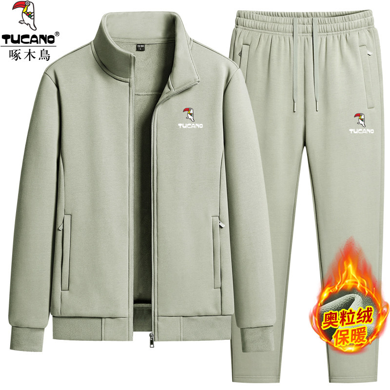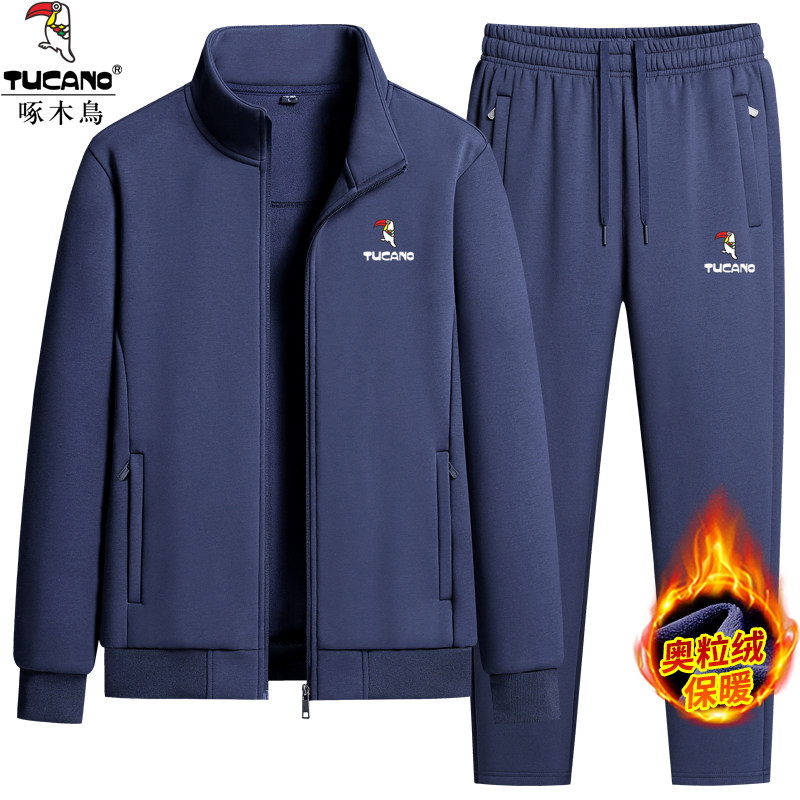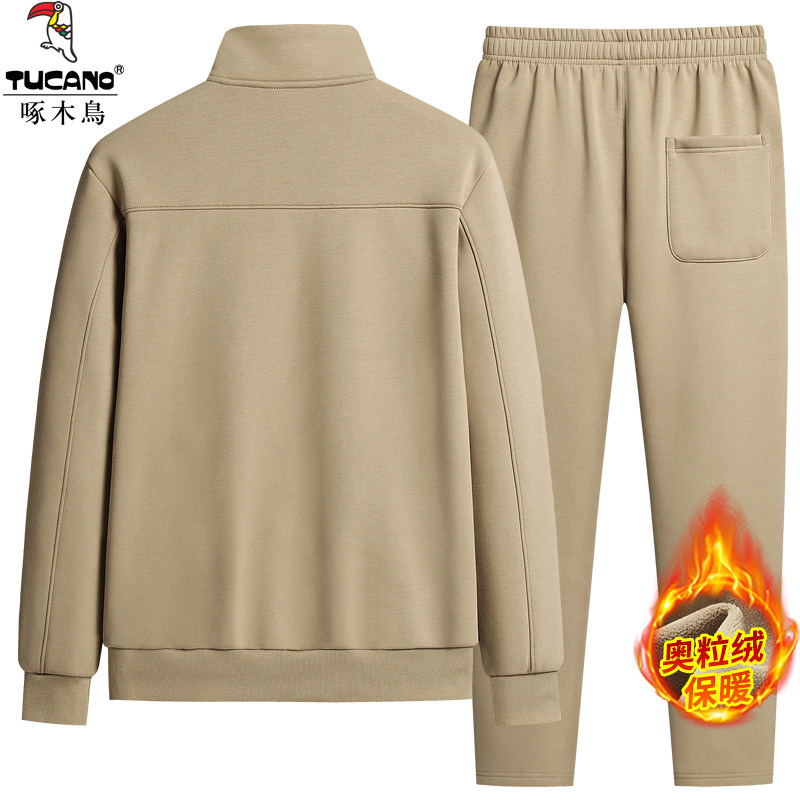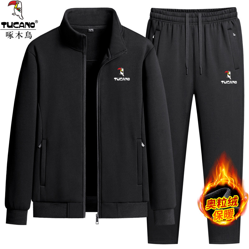 淘宝啄木鸟冬季加绒加厚高端运动套装男士立领开衫卫衣长裤休闲两件套