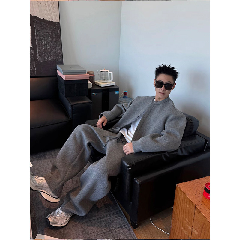 天猫加大码300斤秋松弛感穿搭男款灰重磅假两件开衫卫衣阔腿卫裤套装