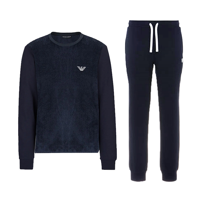 EMPORIO ARMANI男士套装融合品牌经典意式优雅与现代都市休闲风格,全新推出的卫衣卫裤两件套装,采用高品质棉质混纺面料,触感柔软、透气亲肤,兼顾舒适与挺括感。简约利落的剪裁搭配标志性EA徽标点缀,低调彰显奢华品味。卫衣采用圆领设计,袖口与下摆罗纹收口,卫裤则以抽绳腰头搭配束脚版型,轻松打造随性有型的街头造型。整体色调以百搭黑、灰、深蓝为主,适合日常通勤、休闲出行等多种场合。EMPORIO ARMANI以精湛工艺与时尚美学,为现代男士呈现兼具功能性与设计感的都市穿搭之选。