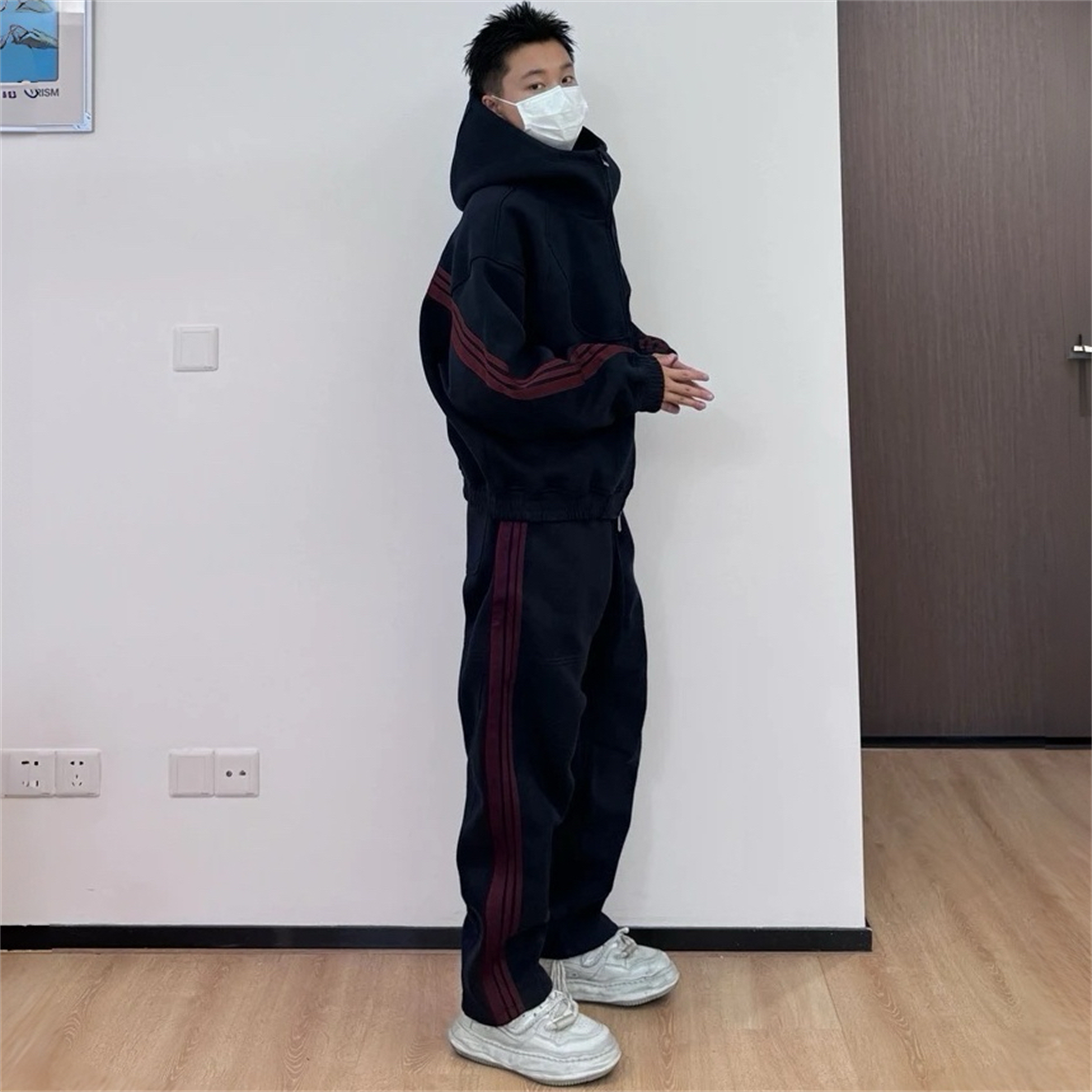 这款美式重磅结构拼接三条杠休闲运动套装,专为秋冬打造,采用厚实保暖面料,兼具挺括版型与舒适穿着感。短宽版设计融合街头潮流元素,凸显男性硬朗气质。衣身以经典三条杠装饰,搭配撞色拼接工艺,视觉层次丰富,彰显运动活力。套装包含卫衣与束脚长裤,整体协调统一,适合日常出街、运动休闲等多种场景。袖口、下摆及裤脚采用螺纹收口,防风保暖且贴合身形。无论是叠穿还是单穿,都能轻松驾驭秋冬穿搭,是追求个性与实用兼备的型男必备单品。