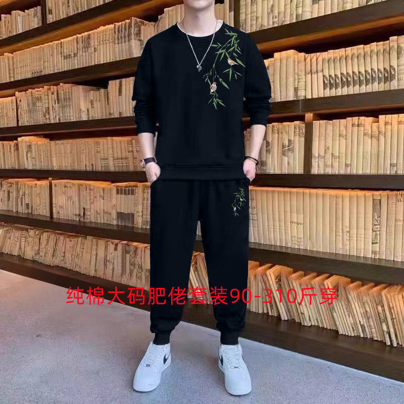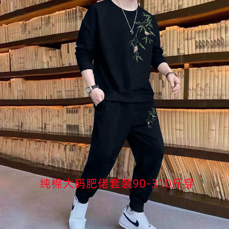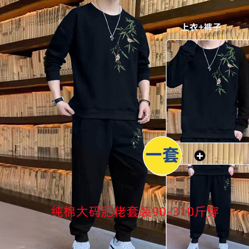 淘宝纯棉大码胖子中国风秋冬卫衣两件套男加肥加大学生运动服长袖套装