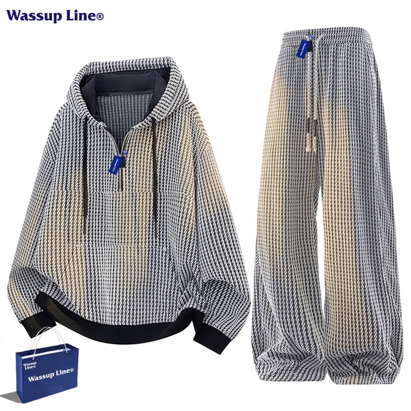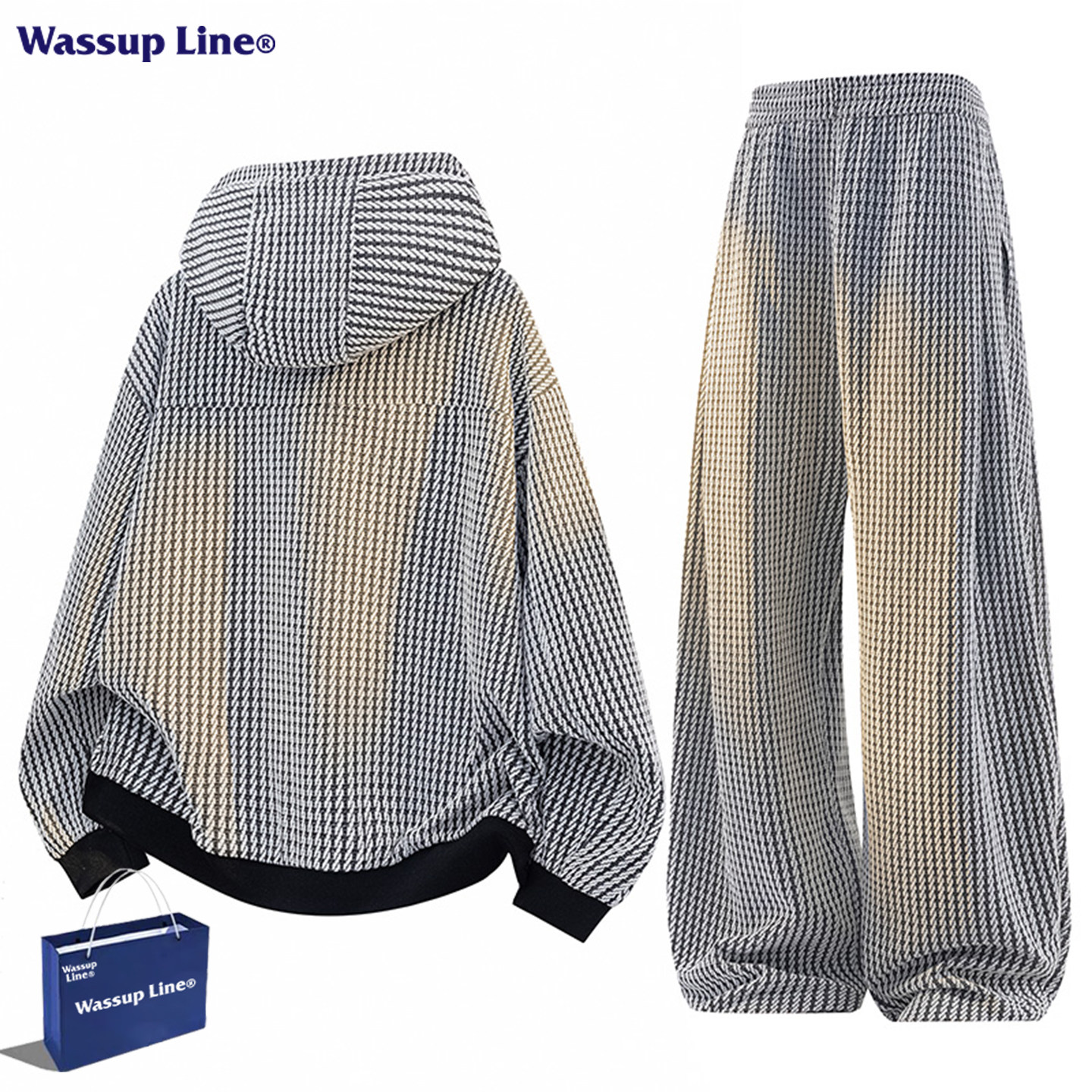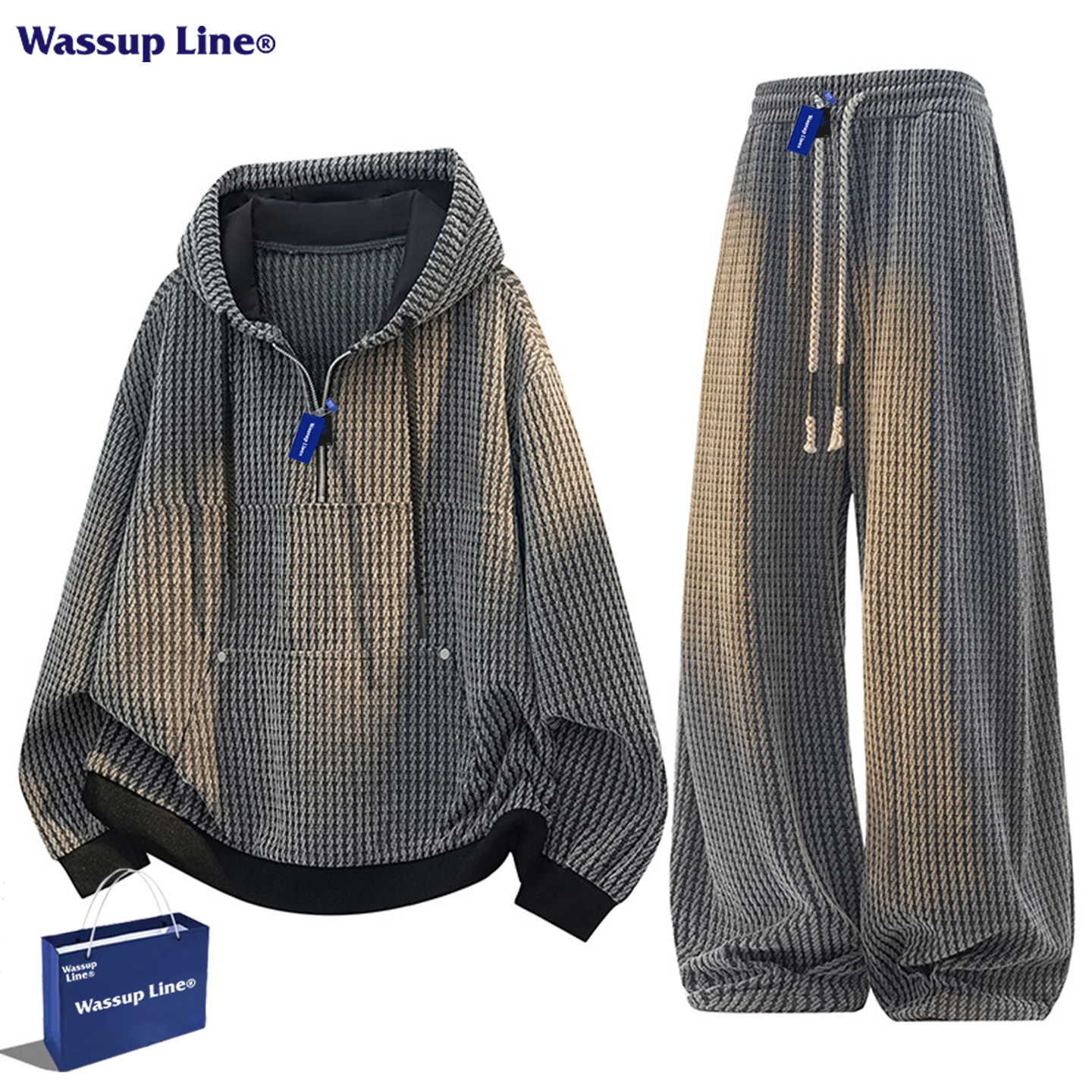 WASSUPLine潮牌男士华夫格连帽卫衣套装,专为追求个性与舒适的都市男性打造。采用高品质华夫格面料,质感挺括、透气亲肤,兼具复古格调与现代潮流感。宽松版型设计,穿着自在无束缚,适合春秋日常穿搭或休闲运动场合。连帽卫衣搭配同系列束脚裤,两件套组合轻松打造街头潮流造型。细节处融入品牌标识与精致走线,彰显品质与态度。无论是出街、聚会还是轻度运动,WASSUPLine都能让你轻松驾驭多种风格,展现随性不羁的型男魅力。简约而不简单,是潮流与实用兼具的理想之选。