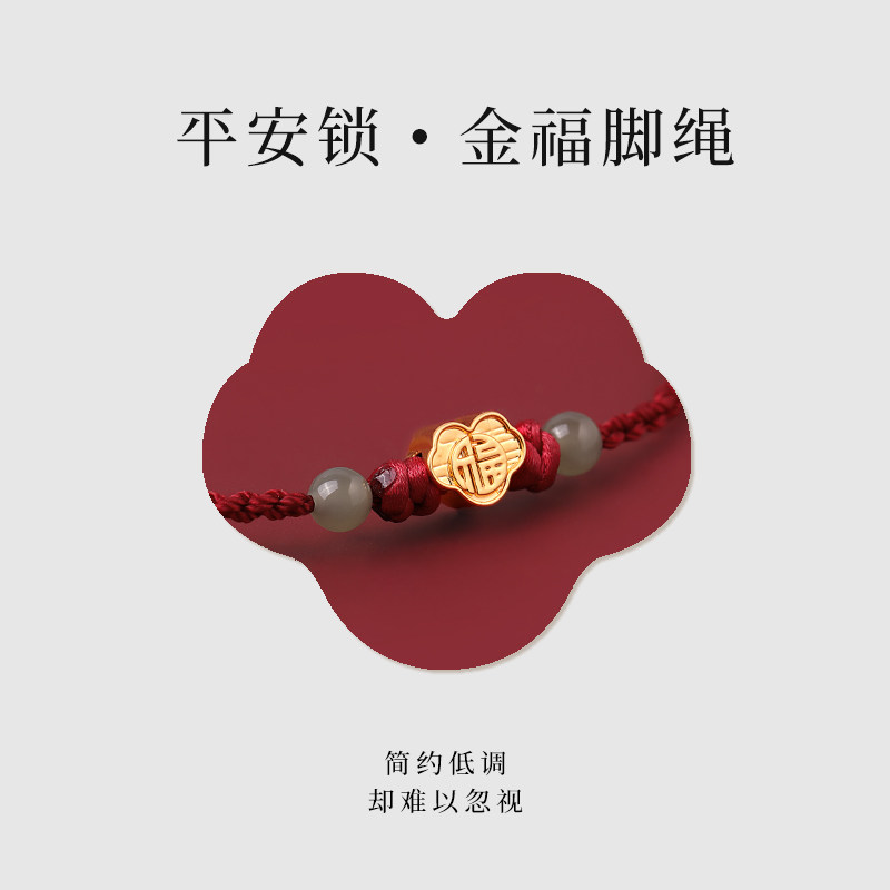 炙真银楼“两世和欢”黄金脚链,专为蛇年本命年女性匠心打造。精选天然和田玉温润点缀,寓意平安吉祥;足金链条精工细作,光泽持久,象征福运绵长。搭配喜庆红绳,融合传统民俗与现代美学,既显雅致又不失吉祥寓意。红绳辟邪纳福,和田玉养心静气,黄金增运添贵,三者结合,祈愿 wearer 在新的一年红运当头、平安顺遂。无论是新年佩戴还是赠予亲友,皆是一份蕴含深情厚意的本命年好礼,承载“两世和欢”的美好祝愿,守护幸福安康。