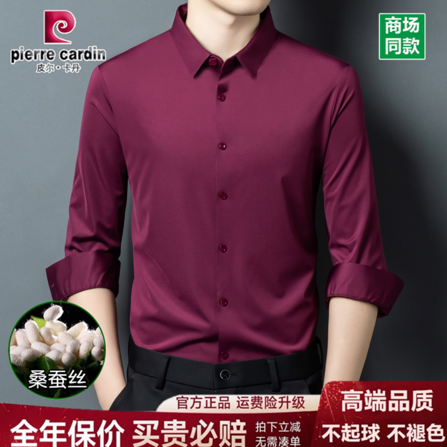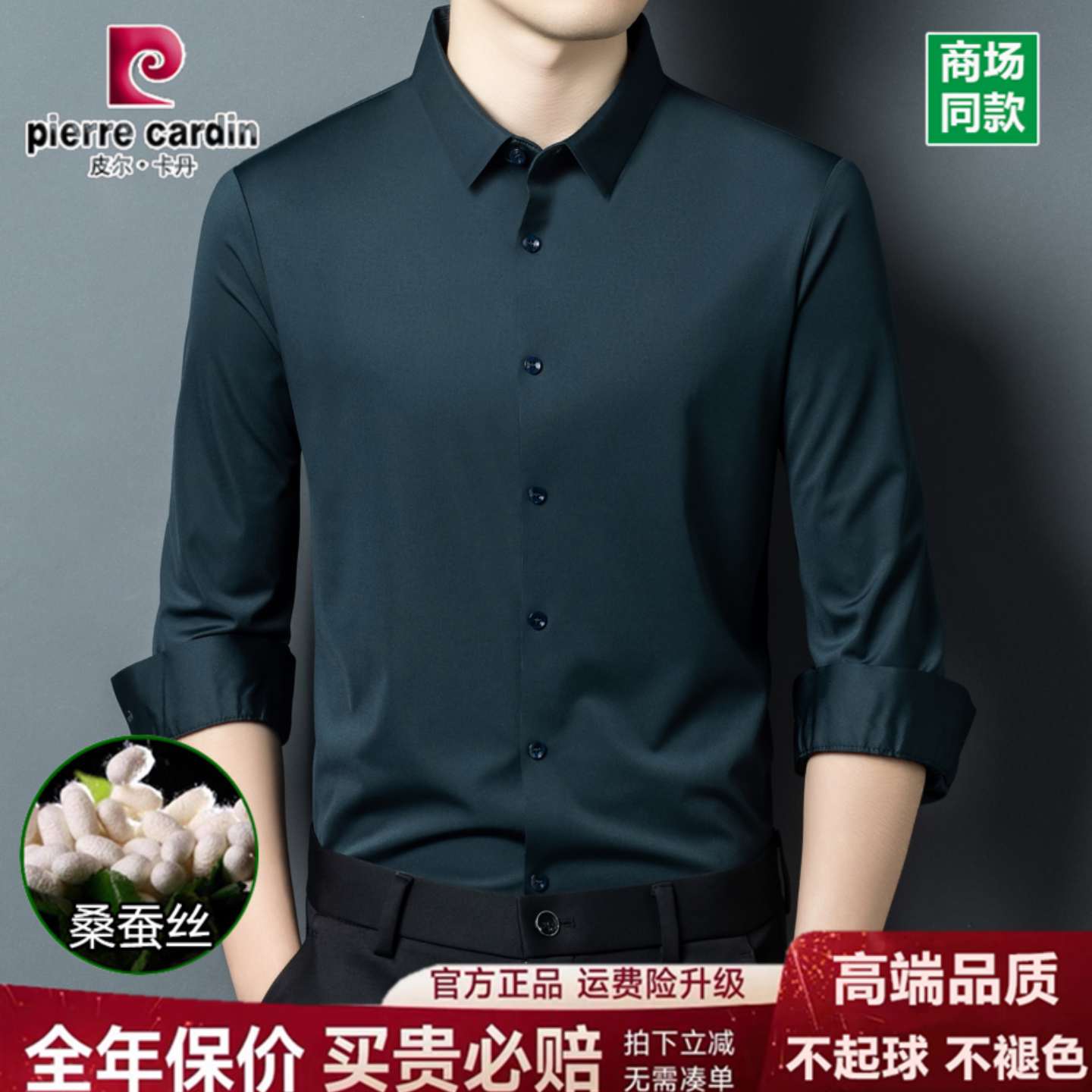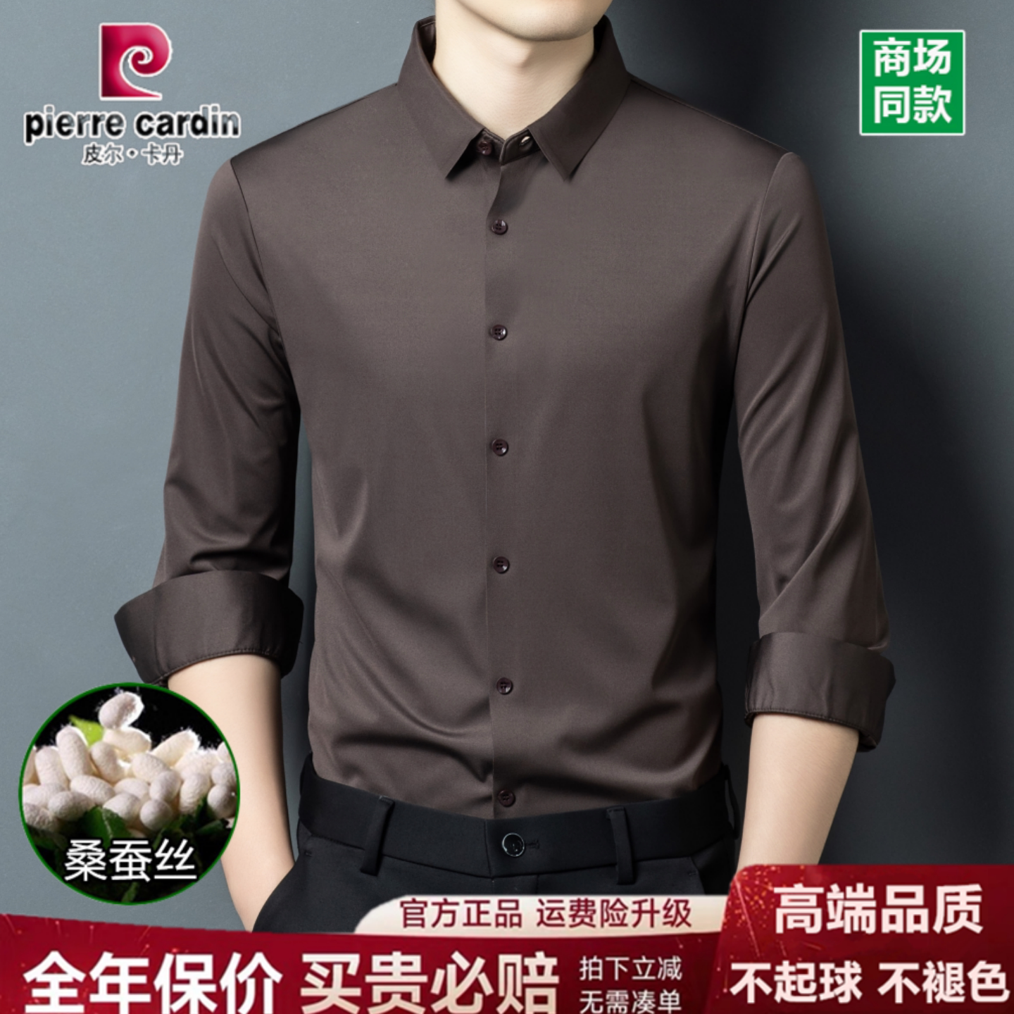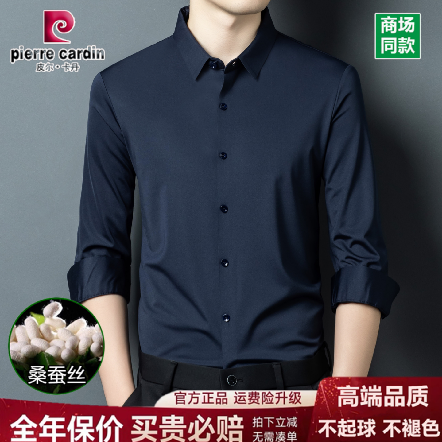 淘宝皮尔卡丹高级感男士桑蚕丝长袖衬衫秋新款款纯色休闲免烫抗皱衬衣
