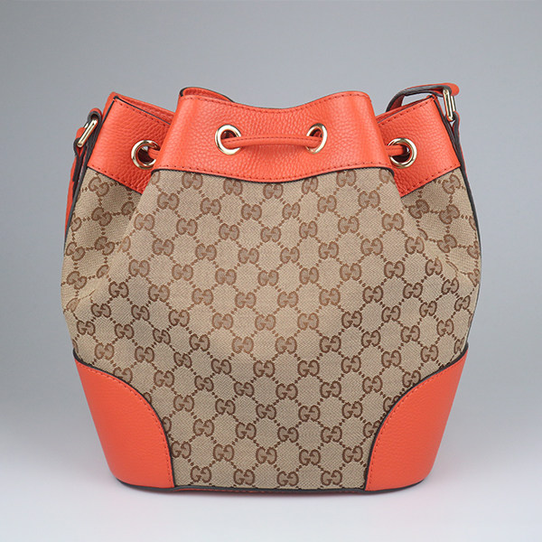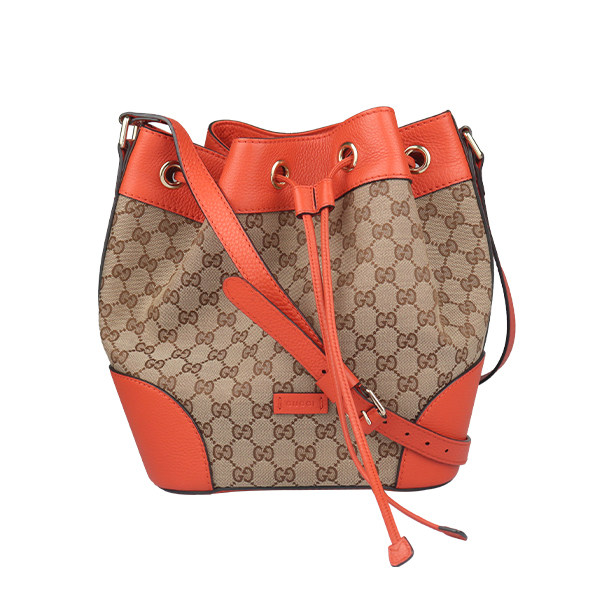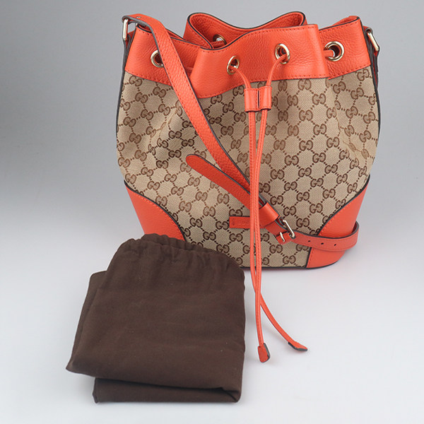淘宝中古9新GUCCI古驰抽绳水桶包米色/橙色GG帆布斜挎包388703
