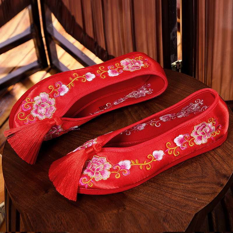 淘宝新款秀禾鞋婚鞋流苏中式新娘婚礼鞋新款绣花鞋女平底千层底民族风