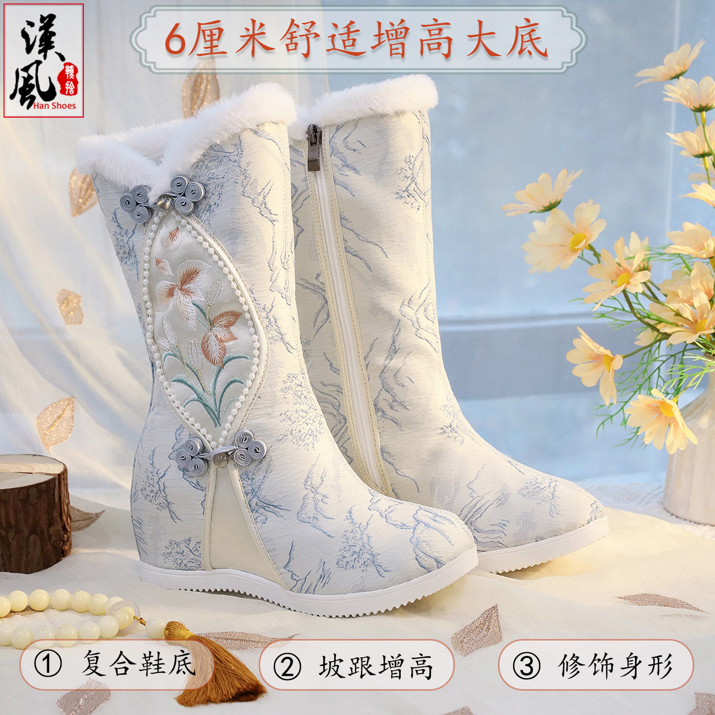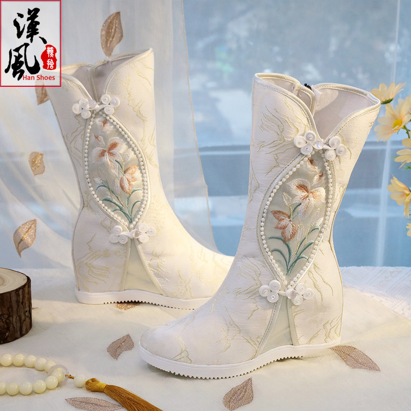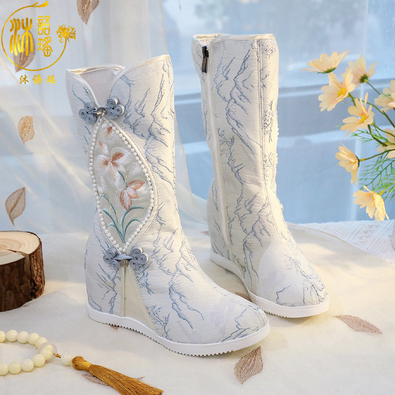 淘冬季搭配古风汉服棉鞋子女绣花内增高明制古装加绒加厚靴子汉元素