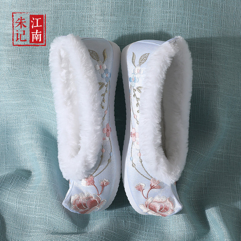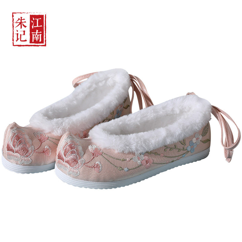 淘宝江南朱记素央加绒汉服鞋冬季加厚浅口古风鞋橡胶底平跟系带绣花鞋