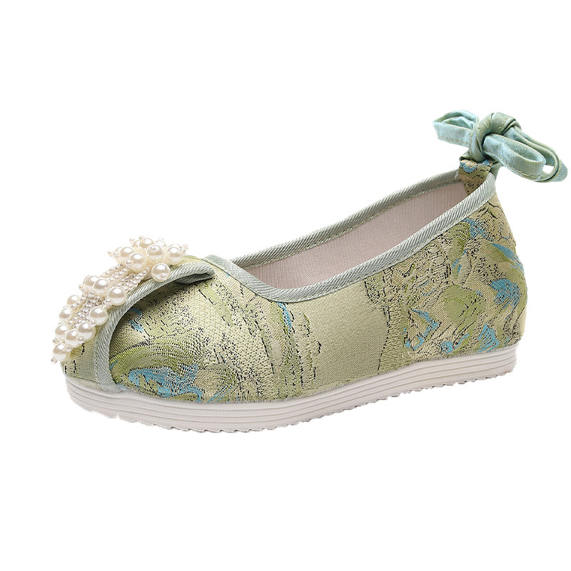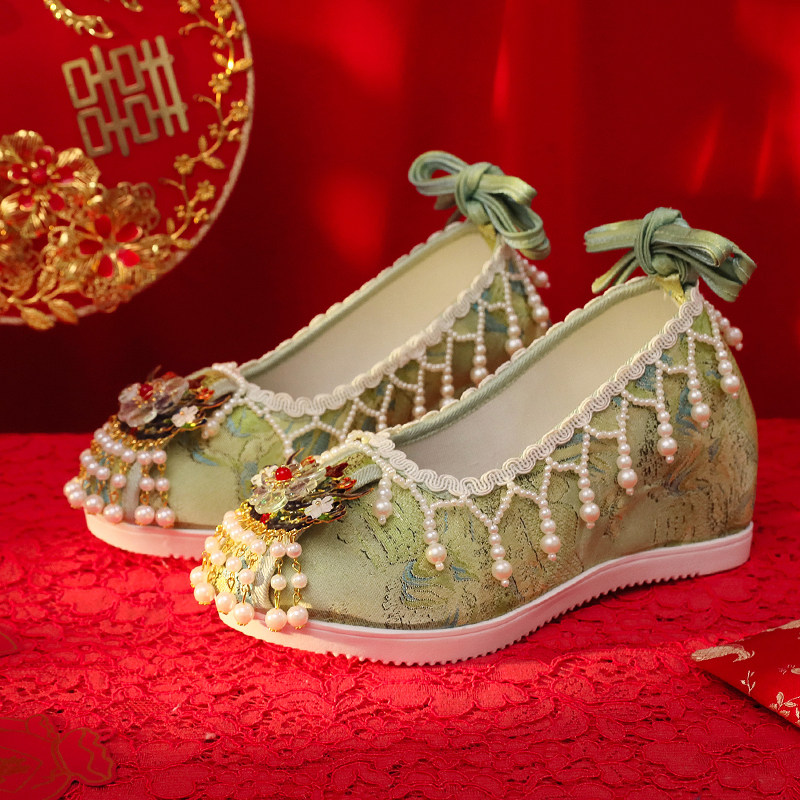 淘宝现货绣禾缘汉服鞋手工串珠内增高布鞋古装秀禾婚鞋绿色明制中式