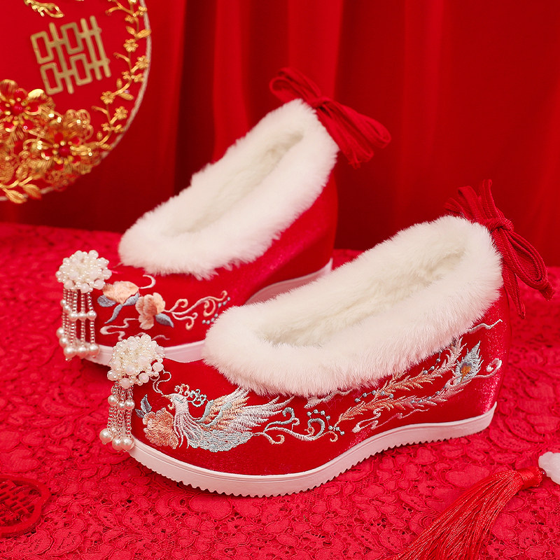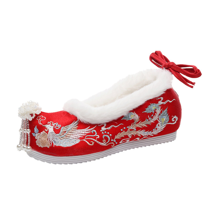 淘宝冬新款手工流苏加绒汉服婚鞋中式红色明制古风绣花鞋秀禾鞋新娘鞋
