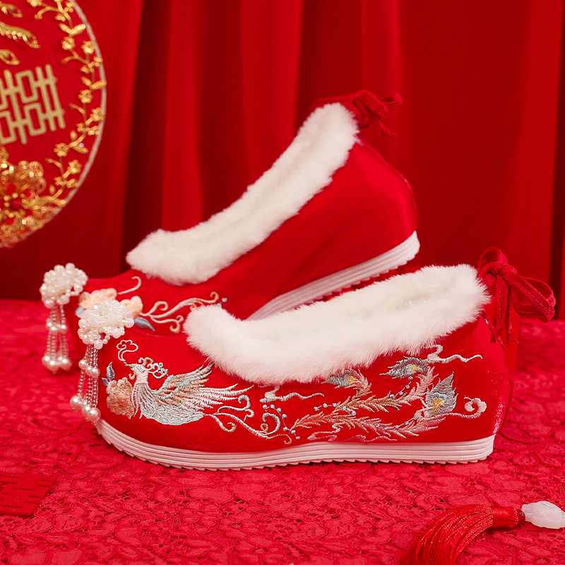 淘冬季加绒古风汉服婚鞋中式复古秀禾鞋民族风绣花鞋配旗袍红色结婚