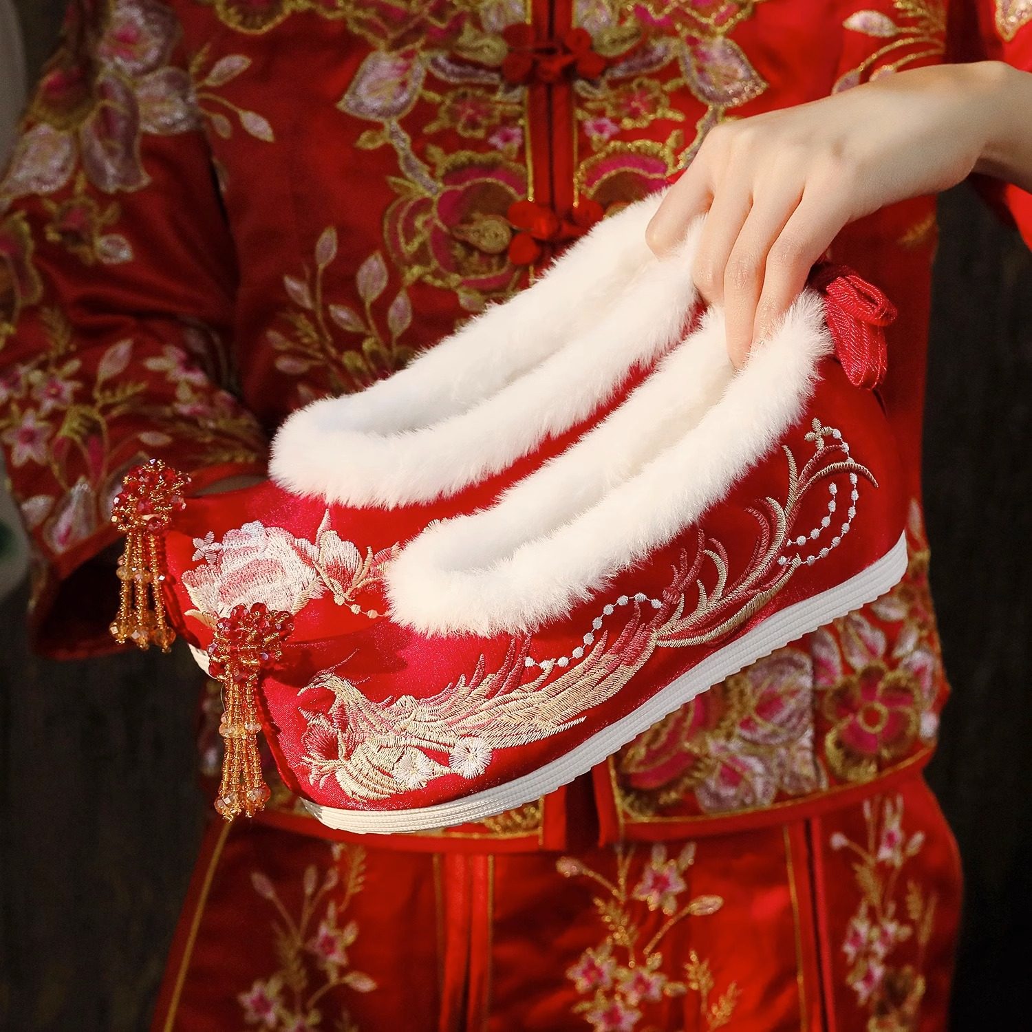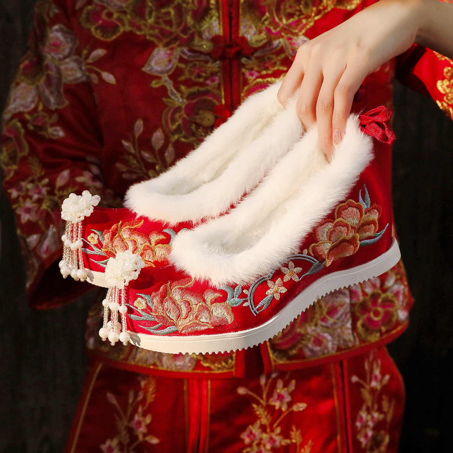 冬季加绒古风汉服婚鞋中式复古秀禾鞋民族风绣花鞋配旗袍红色结婚