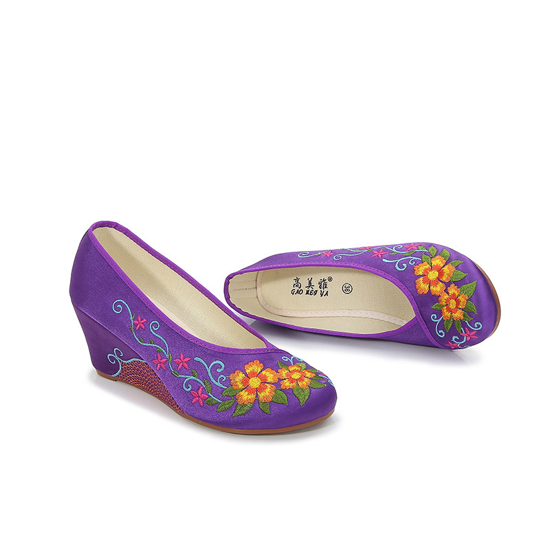 淘宝高美雅新款步月登云单鞋日常圆头古风浅口花朵坡跟高端绸缎绣花鞋