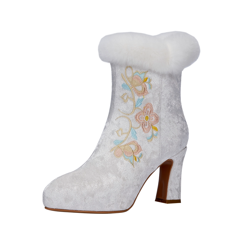 淘宝百搭保暖柔软真兔毛毛圆头绣花粗高跟旗袍女靴子中筒高级感国风鞋