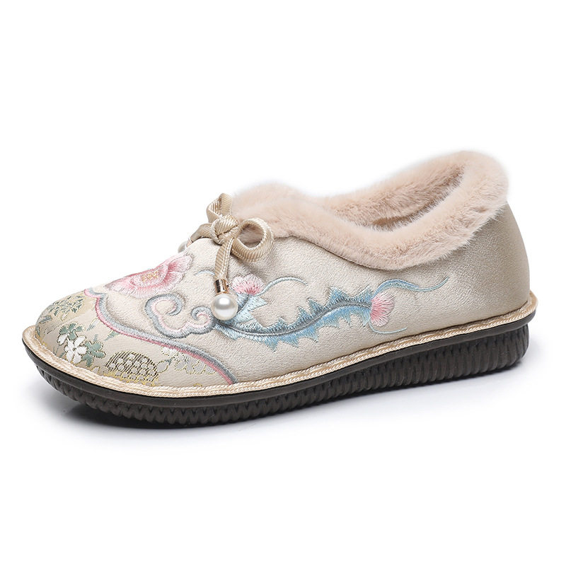 冬季老北京布鞋女绒软底一脚蹬舒适妈妈鞋复古保暖绣花棉鞋防滑