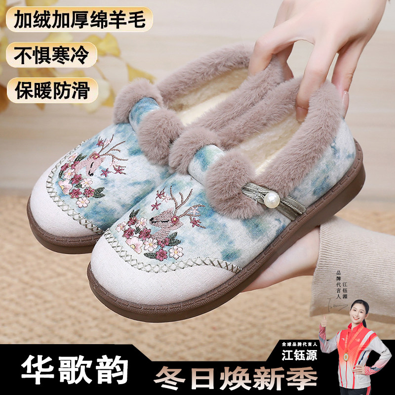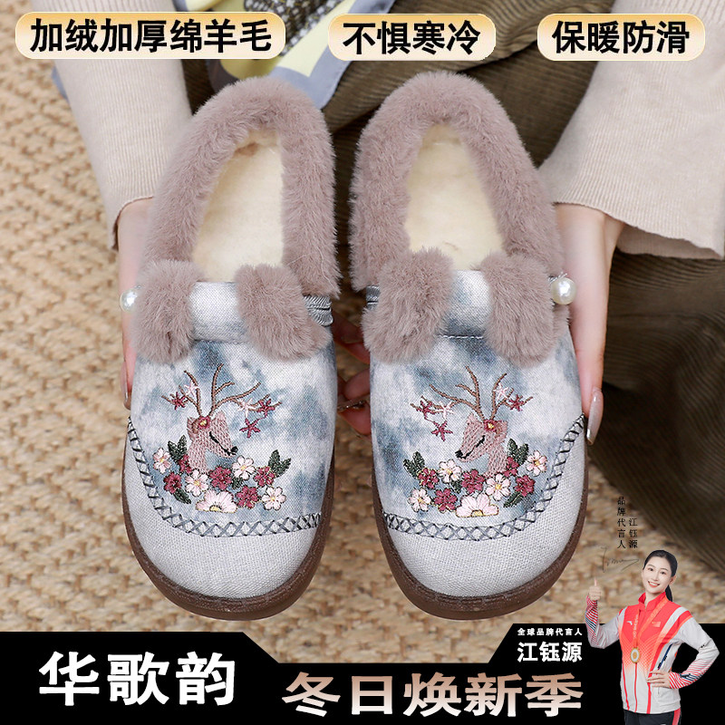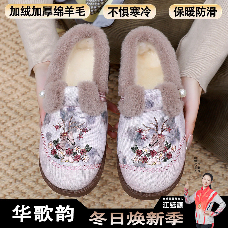 淘冬季老北京布鞋女绒软底一脚蹬舒适妈妈鞋复古保暖绣花棉鞋防滑