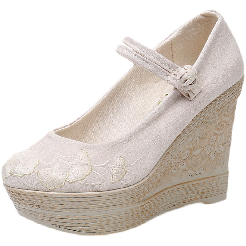 淘宝春新古风女鞋汉服鞋子民族风坡跟古风超高跟防水台绣花鞋国风布鞋