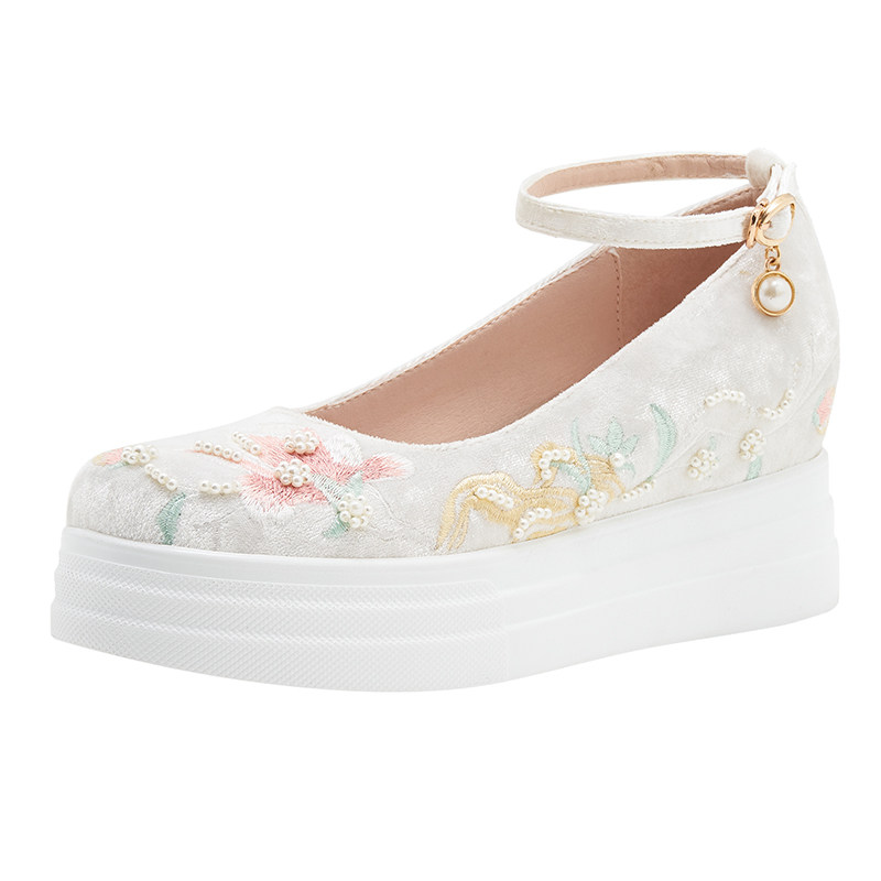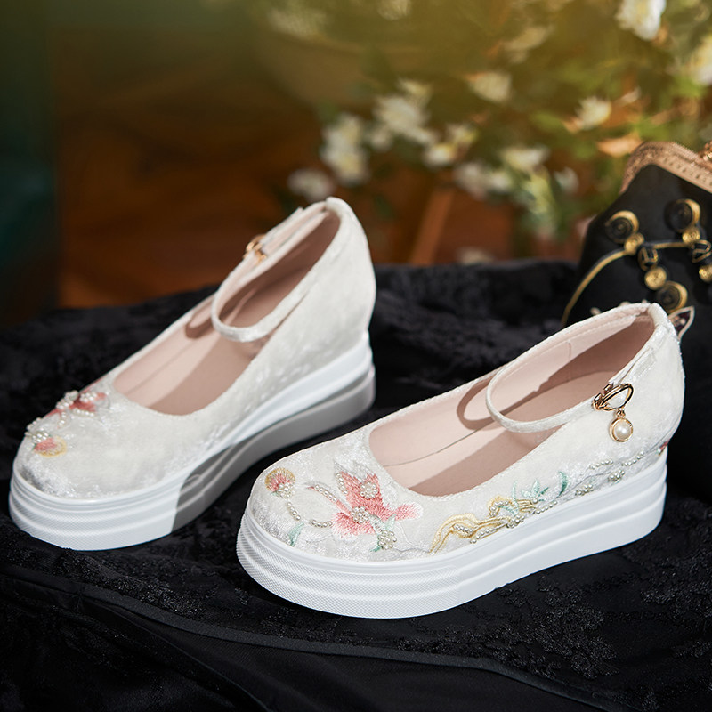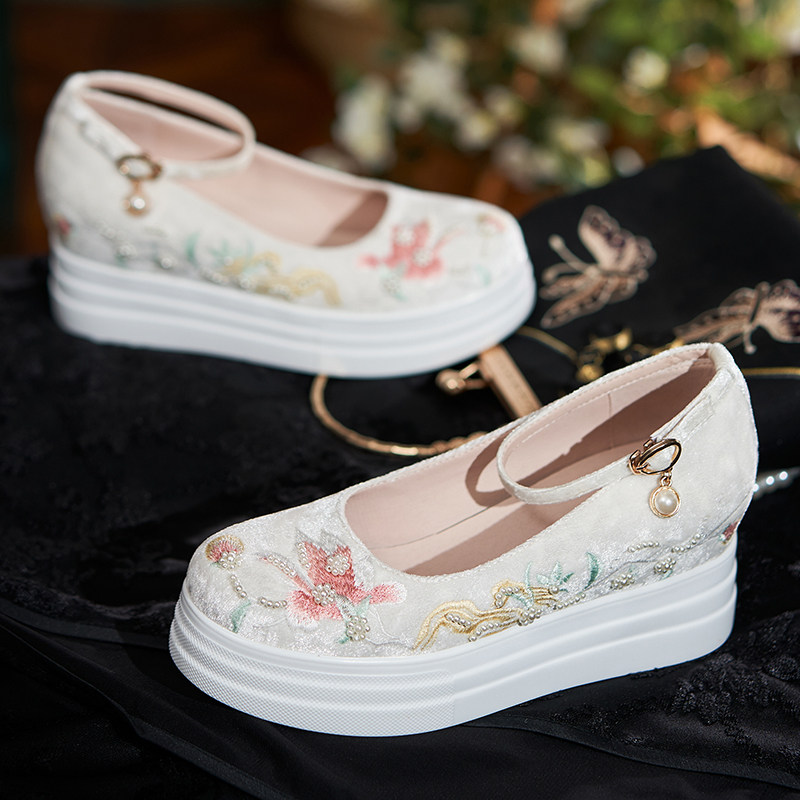 淘宝小个子松糕百搭汉服鞋刺绣花鞋圆头古装古风厚底内增高 不累脚7CM