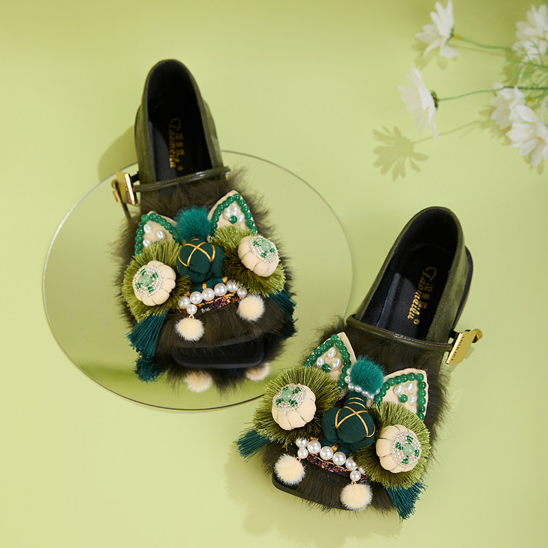 天猫虎头鞋女成人2025春季新款绣花鞋绿色平底玛丽珍鞋古风汉服鞋子