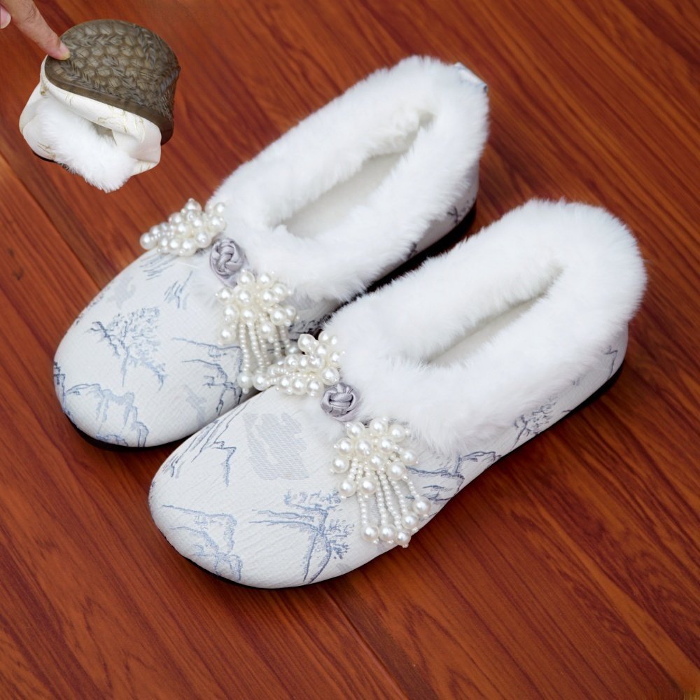 淘宝冬季老北京布鞋女绒软底一脚蹬舒适妈妈鞋复古保暖绣花棉鞋防滑